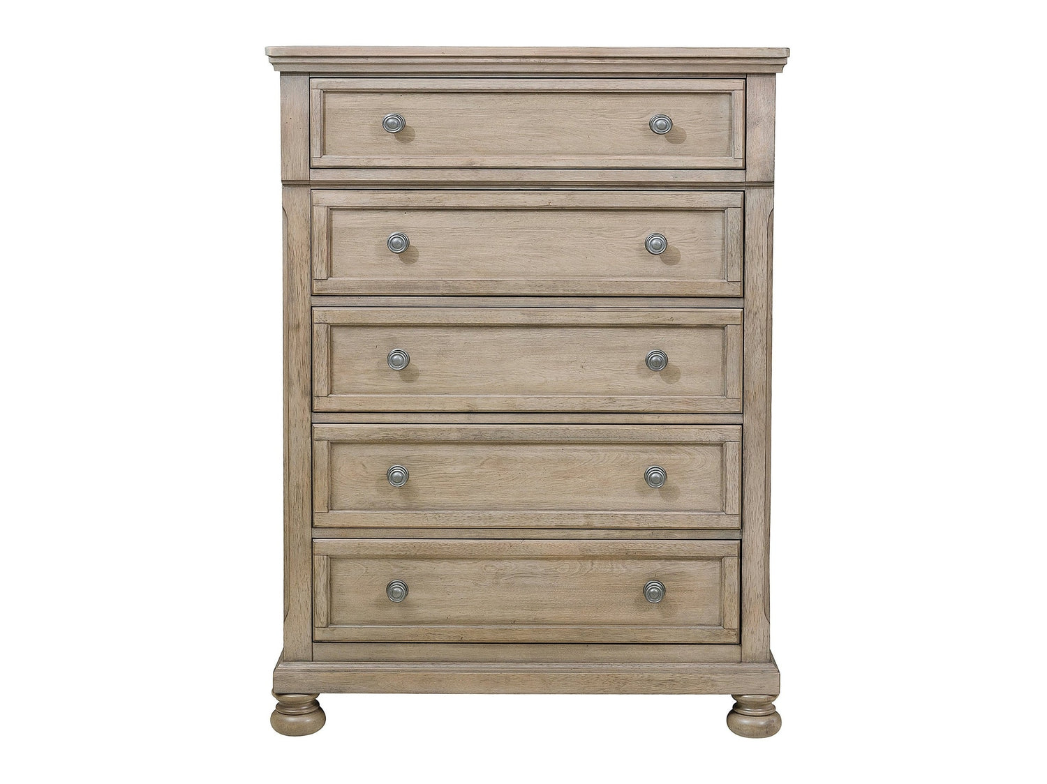 An updated classic addition for your transitional bedroom is the Bethel Collection. Traditional accents, such as turned bun feet support the chest, and a gray, lightly wire-brushed finish on birch veneer and selected hardwoods, blends with framing and lines that complement your personal style. Coordinating Queen bed, Eastern King, California King bed, mirror, dresser and nightstand are also available, as well as an antique white finish option.