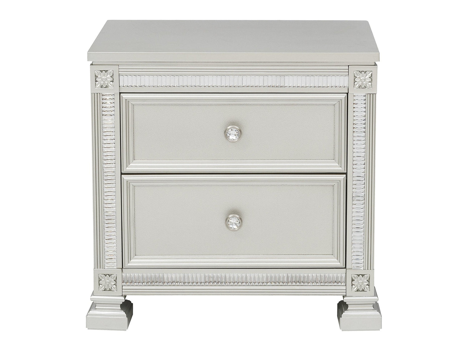 Modern glamour is exemplified in the design of the Bevelle Collection. Acrylic crystals frame the night stand, reflecting the light to create eye-catching drama. The silver finish serves as the perfect complement to the high-polish decorative knob hardware and medallion accents.