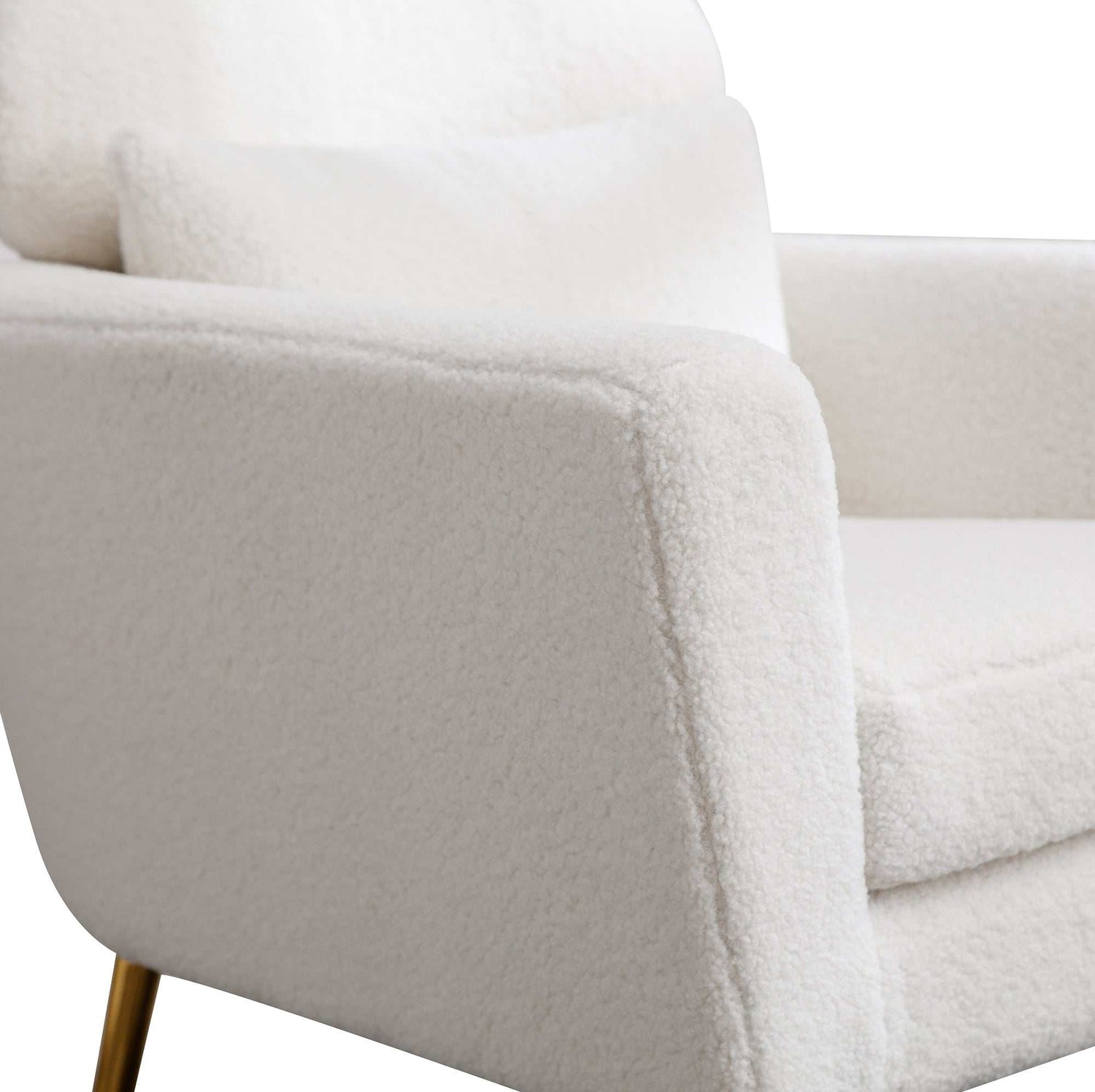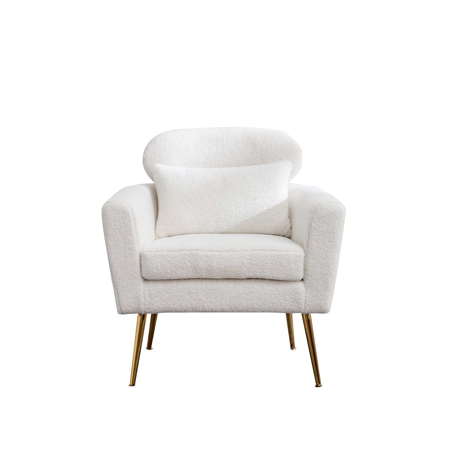 Elevate your living space with our sophisticated Modern Bouclé Accent Chair. This armchair is meticulously upholstered in cozy Ivory Bouclé fabric, offering a plush and inviting seat. The elegant gold metal legs not only provide stability but also add a touch of glamour to any room. Whether in the living room, bedroom, dorm room, or office, this chair is designed for comfort and style. It comes complete with a matching throw pillow for added coziness.