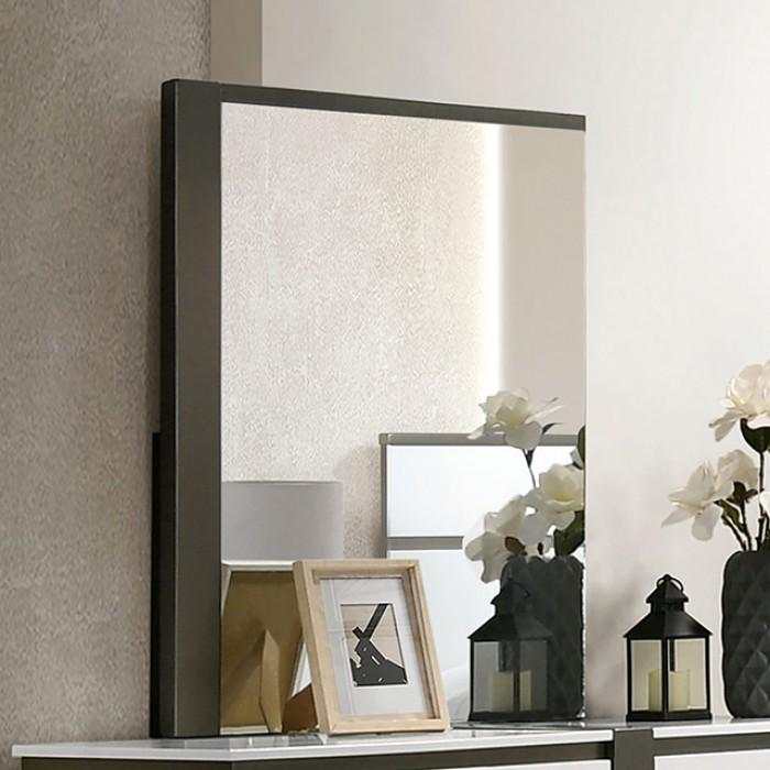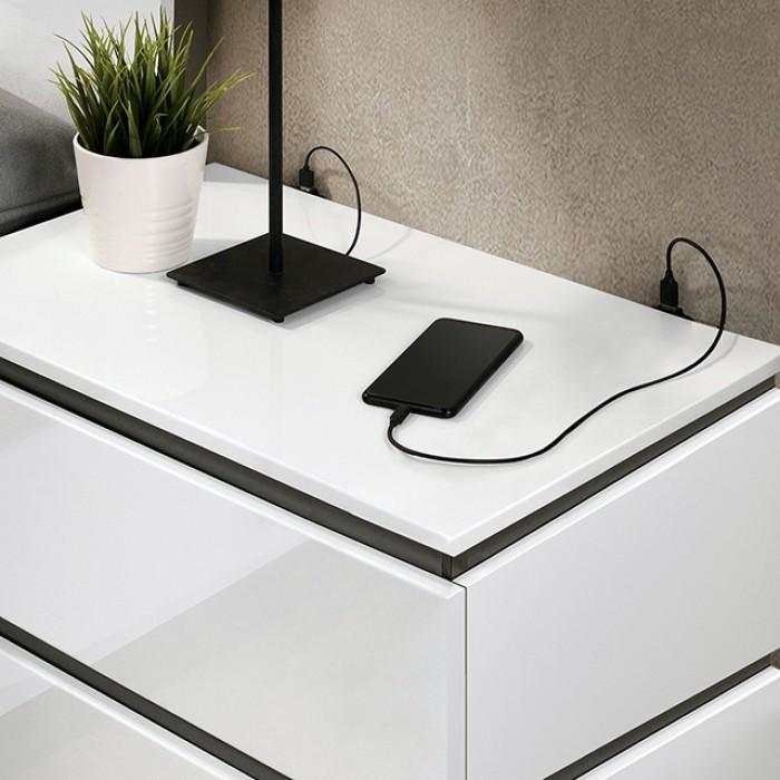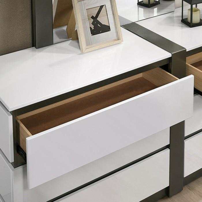 Just one look, and there is no doubt where this bedroom set belongs--in a modern home. For starters, a striking two-tone design is produced by allowing large blocks of high gloss white to be interrupted by dark, metallic gray gaps. The headboard and case good panels all feature this bold color contrast. True to modern pieces, drawer handles are out of sight, as the gaps serve as concealed pulls as well. Look closer, and you'll notice how the gaps themselves are not even in width; this purposeful asymmetry adds more to the appeal and modern vibe.
