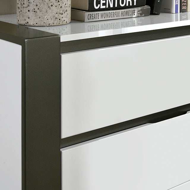 Just one look, and there is no doubt where this bedroom set belongs--in a modern home. For starters, a striking two-tone design is produced by allowing large blocks of high gloss white to be interrupted by dark, metallic gray gaps. The headboard and case good panels all feature this bold color contrast. True to modern pieces, drawer handles are out of sight, as the gaps serve as concealed pulls as well. Look closer, and you'll notice how the gaps themselves are not even in width; this purposeful asymmetry adds more to the appeal and modern vibe.