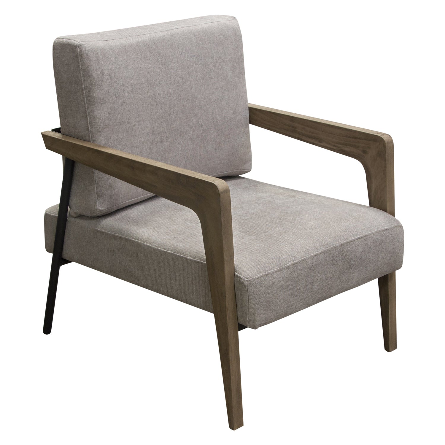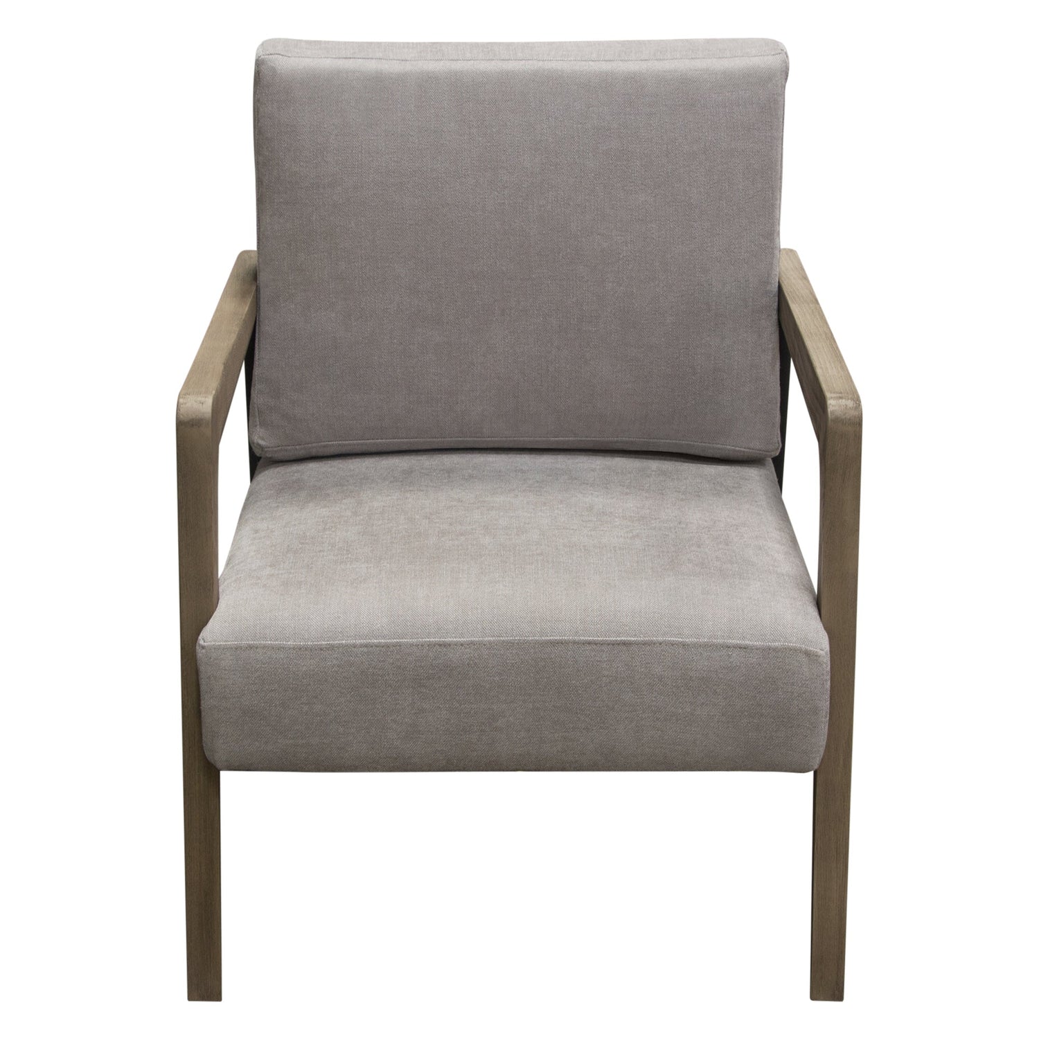 - Attached seat and back cushions with exposed welt detail, provide a clean, minimalistic backdrop to the plush grey polyester fabric and wood trim and leg.