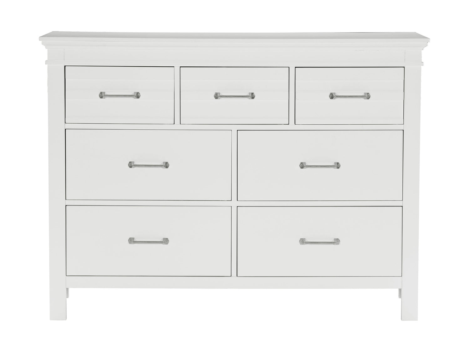 The transitional styling of the Blaire Farm Collection serves as the perfect complement to the rustic aesthetic that inspired the design. Fixed handle pull hardware fronts the drawers while horizontal accent at the top drawers lends visual contrast. The white finish that covers the dresser lends to a versatile look sure to be a perfect fit in your home.