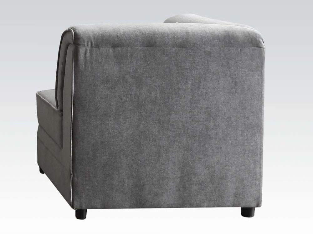 Assembled, Modular Wedge & 1 Pillow Tight Back & Seat Cushion (1+1) Backrest Style: Cushion w/Welt Trim Seat Construction: Pocket Coil, Inside Frame: Wood & Foam, Box Seat Cushion w/Welt Trim Plastic Round Leg: Black Finish Material: Gray Velvet (Solid Pattern) Square Pillow: Constrast Pattern