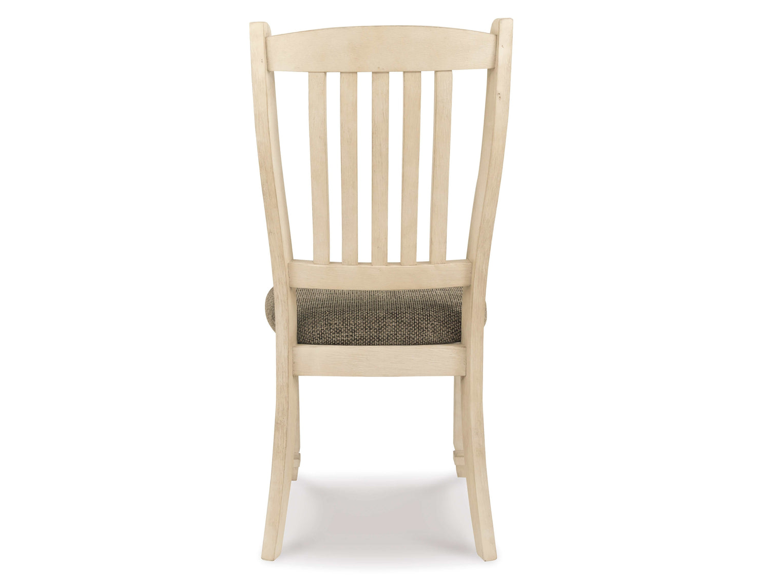 The beauty of this upholstered dining chair is something to savor. Designed to serve up comfort and flair, this rake-back dining chair entices with a cushioned seat covered in a heavy woven fabric that complements the chair’s antiqued white finish.