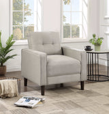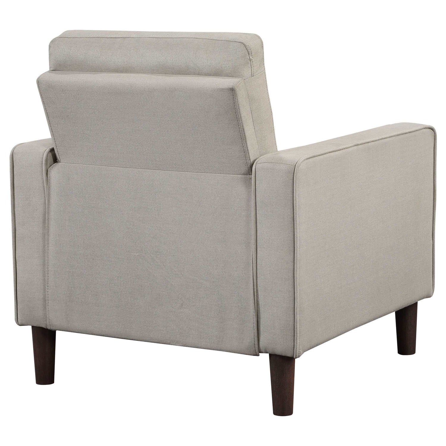 Ideal for studio apartments or small rooms, this chair boasts a perfect small-scale design. Its classic track arm and self-welt detailing highlight the superior tailoring. The grid-tufted boxed back cushions and pocket coil spring cushion construction ensure comfort and support. With brown tall round tapered legs, it offers a sturdy foundation. Assembly is a breeze, and its solution-dyed performance fabric is easy to clean.