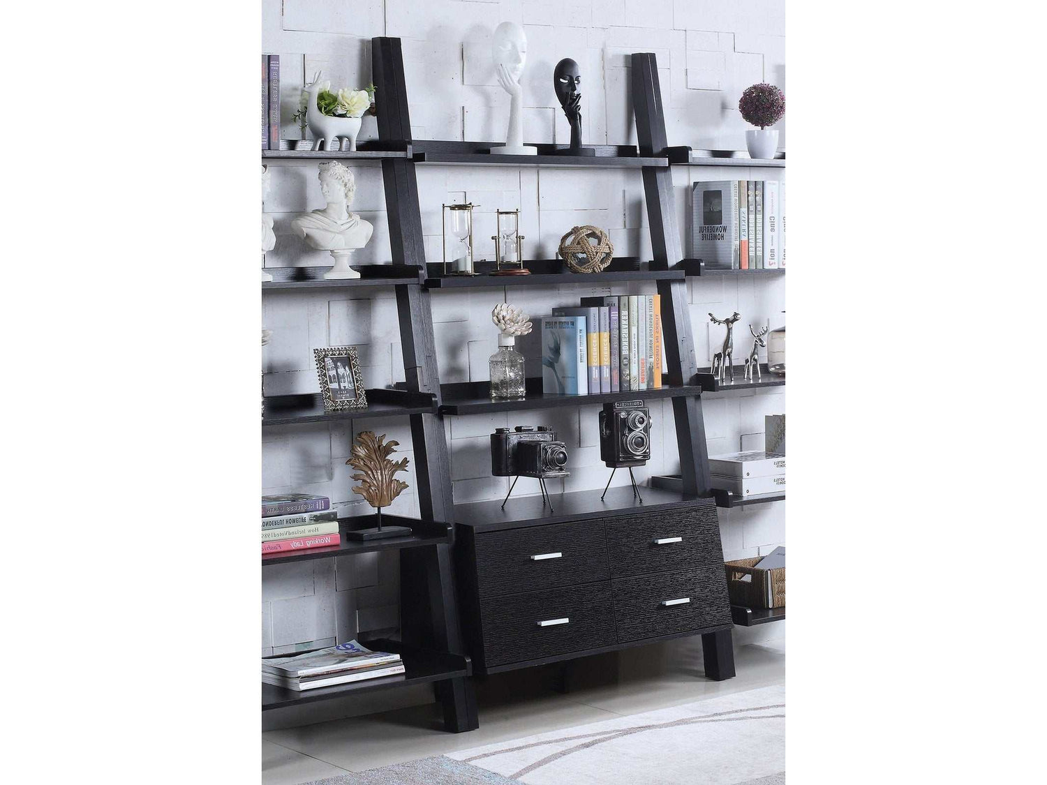Enjoy sleek style and convenient functionality. With multiple options for storage, this ladder bookcase is tasteful and versatile. Three sturdy shelves are elegantly suspended over a large, lower cabinet with four drawers. The drawers feature Euro glides for smooth and gentle ease of use. Finished in rich cappuccino, this bookcase adds eye-catching glamour to any room.