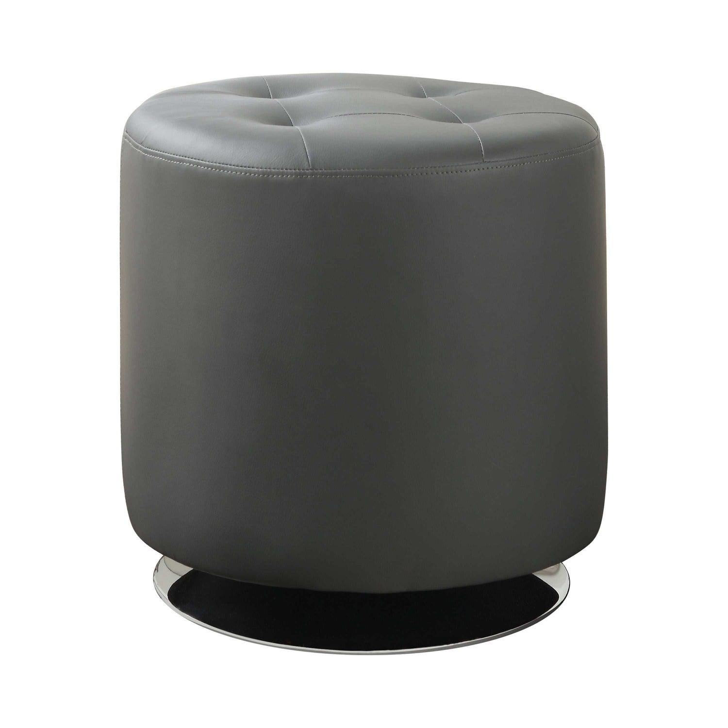 Accent a casual space with this dynamic ottoman. An attractive silhouette blends round styling with a tall, narrow profile. Lovely grey leatherette delivers a fashionable shade with easy-care maintenance. A chrome swivel base dresses up its chic look and provides comfortable motion for foot resting. With a tufted surface, it reflects a charming attitude.