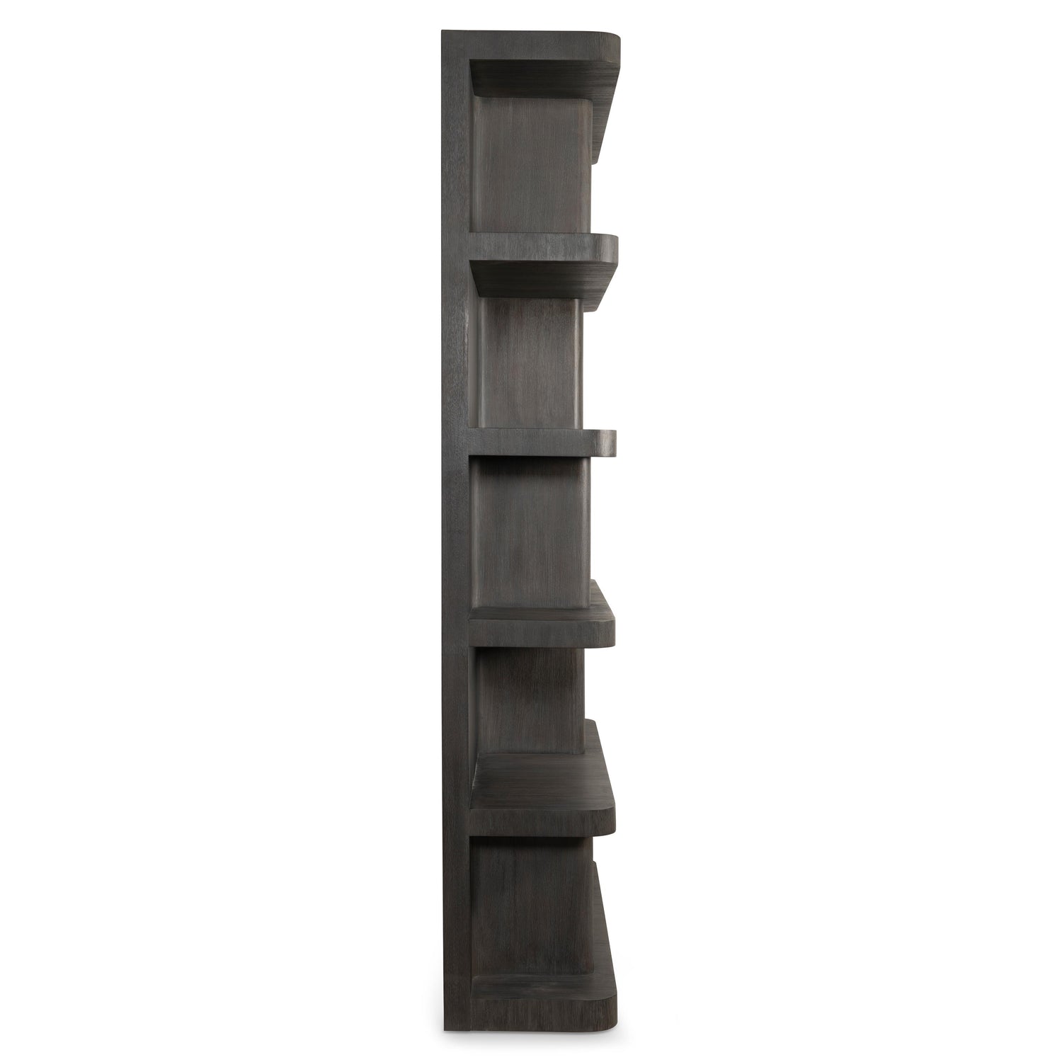 - Five fixed shelves, each with one or two partitions that create a unique configuration for each shelf