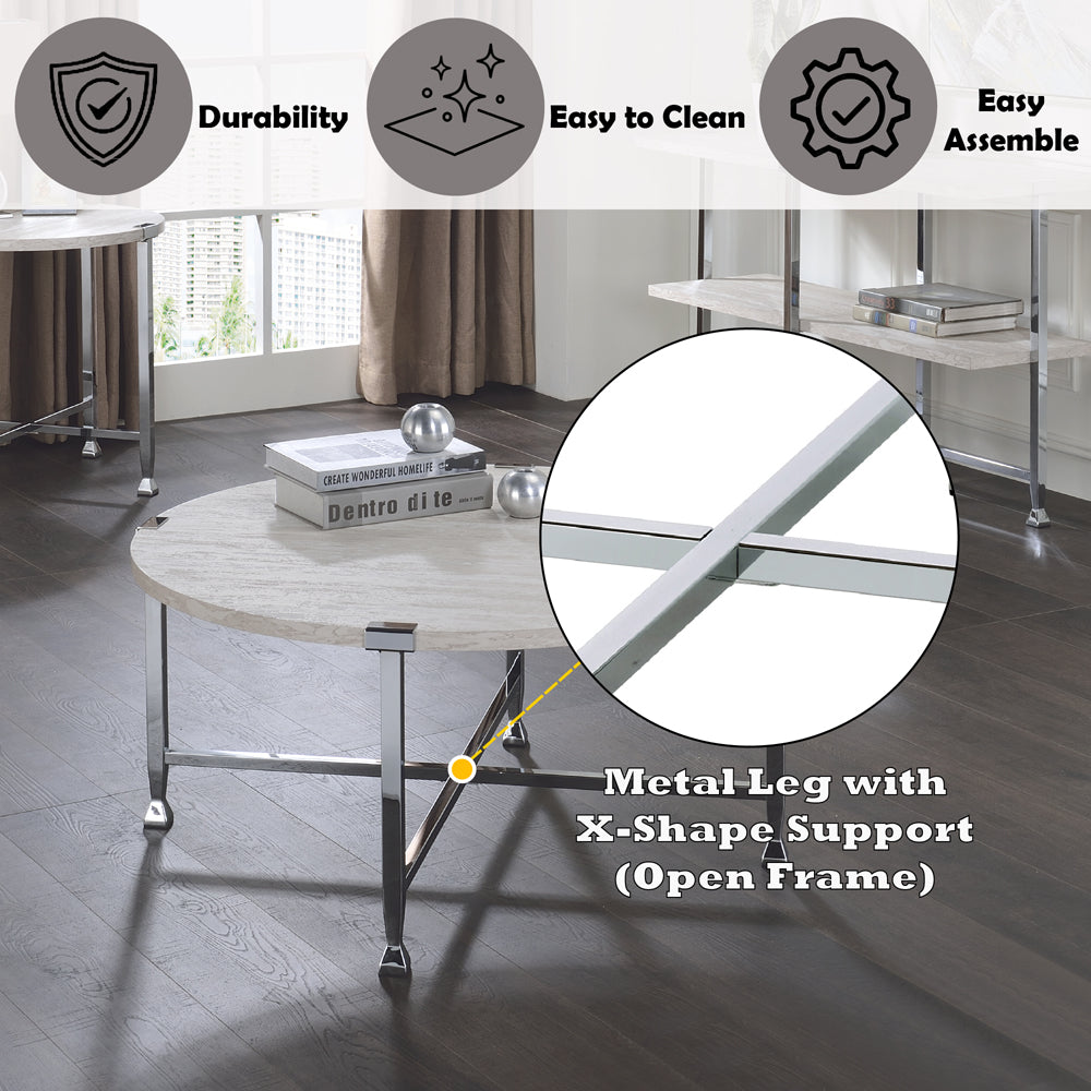 KD, Round Coffee Table NO Storage () Wooden Top, Metal Frame Leg with X-Shape Support (Open Base) CONSTRUCTION] Wooden Top: Paper Veneer+PB Metal Leg/Frame & Crossbar Support: Metal Tube