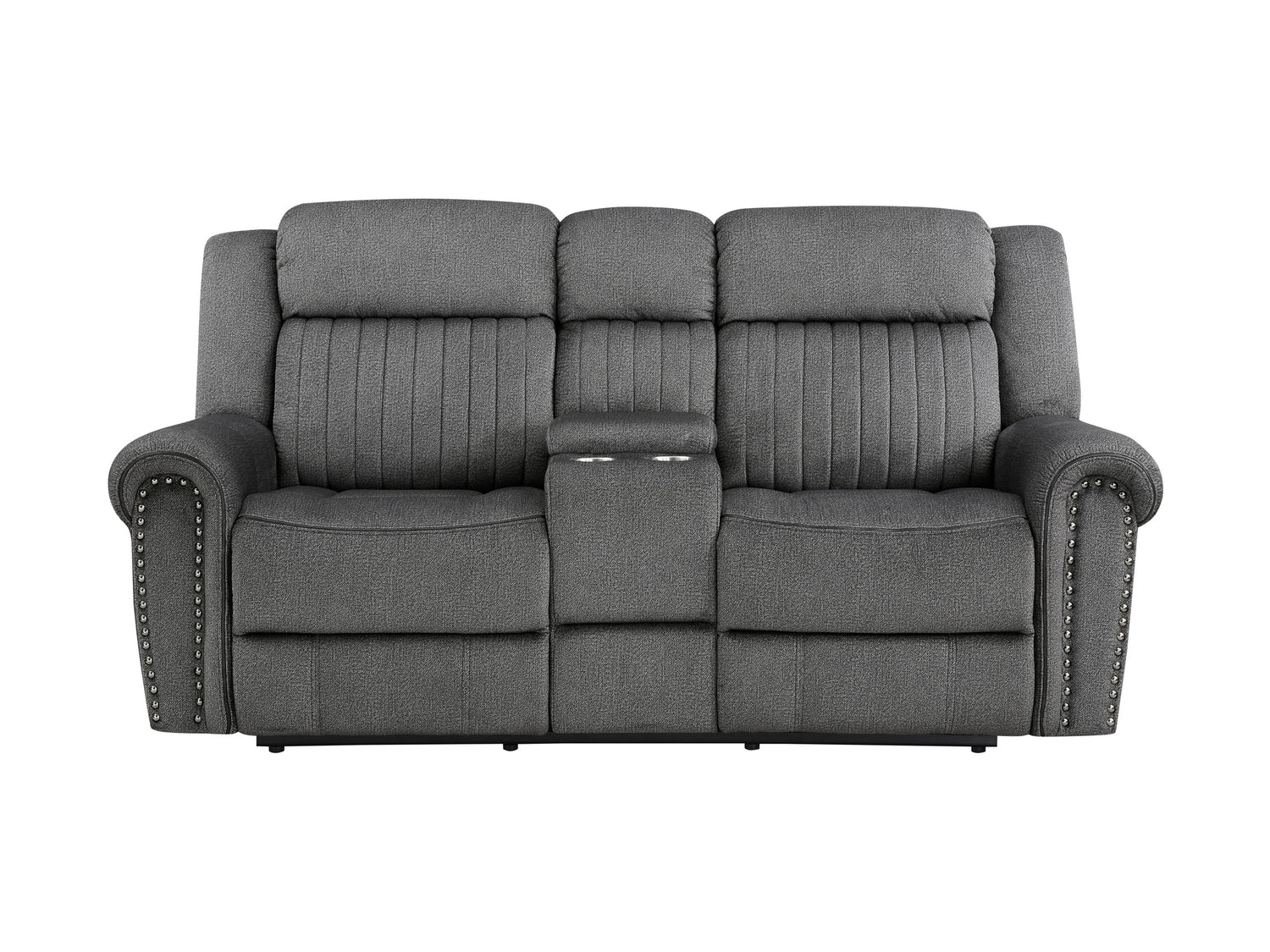 Styled for the transitional home, the Brennen Collection’s comfortable presence will be a perfect match for your casual living room. The love seat features power reclining mechanisms allowing for ease of motion when going from seated to reclined. Additional functionality comes in the form of the love seat’s console, its lift-top hidden compartment and cupholders providing a convenient spot for beverage and accessory storage. Plush seating is defined by the contoured stitching, while the arms of the love seat are accented with nail head trim. Charcoal-hued textured microfiber covers the seating group, providing soft touch and decorative versatility.