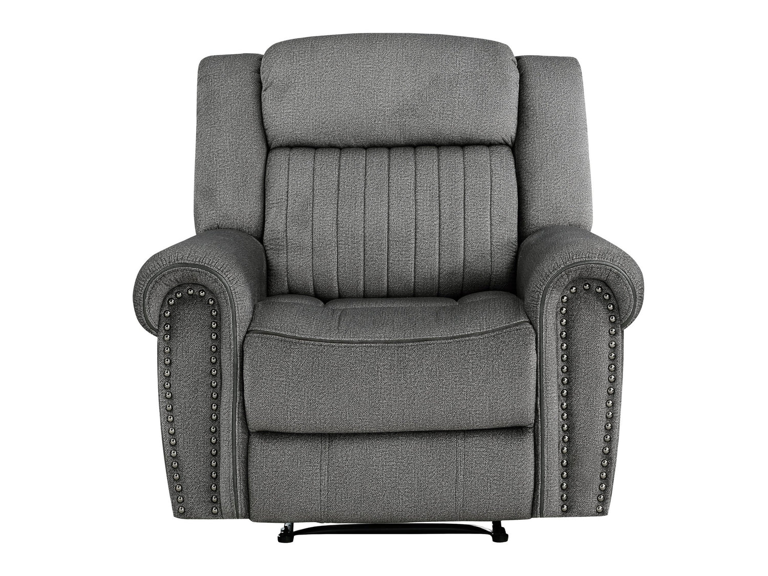 Styled for the transitional home, the Brennen Collection’s comfortable presence will be a perfect match for your casual living room. The chair features a manual reclining mechanism allowing for ease of motion when going from seated to reclined. Plush seating is defined by the contoured stitching, while the arms of the chair are accented with nail head trim. Charcoal-hued textured microfiber covers the seating group, providing soft touch and decorative versatility.