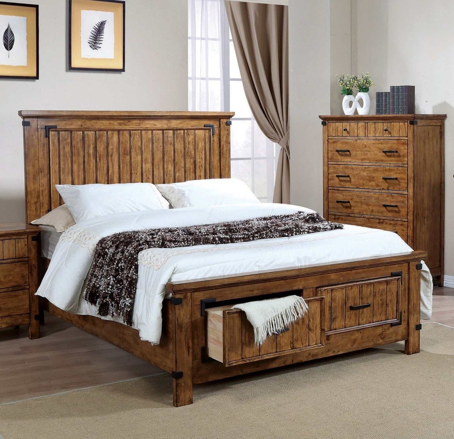 The Brenner collection features this bed inspired by the countryside. It has crisp, clean lines that give it a classic yet elegant appearance. The impressive headboard and low-profile footboard both are crafted with vertical paneling for a handsome appeal. The footboard features ample, built-in drawer storage capabilities. Finished in rustic honey with wood grain accents, this bed conveys a rustic ambiance.