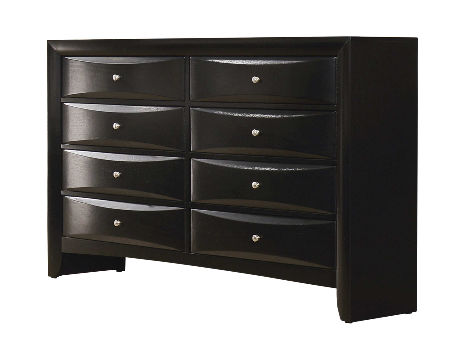 This superb 4-piece bedroom set from the Briana collection includes a nightstand and dresser. The centerpiece of the set is an impressive bed with a slightly flared leatherette-padded headboard and low-slung footboard. The clean, smooth dresser and nightstand are fashioned with beveled drawers with contrasting brushed chrome accents. A tall, rectangular mirror easily fits on top of the dresser to complete the practicality of the set. Each piece is finished in a classic, timeless black that adds an air of class to the bedroom ambiance.