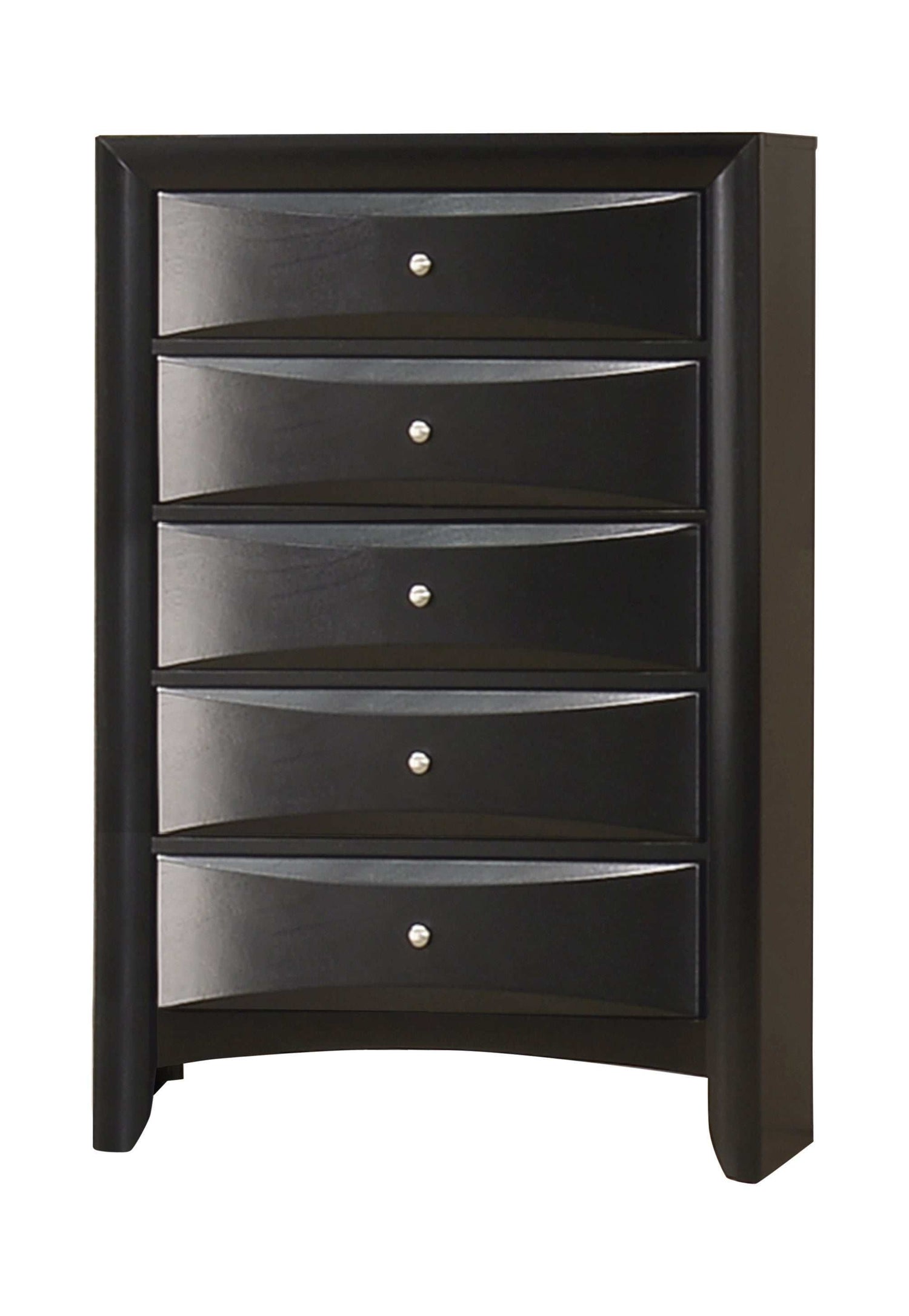 This superb 5-piece bedroom set from the Briana collection includes a nightstand and dresser. The centerpiece of the set is an impressive bed with a slightly flared leatherette-padded headboard and low-slung footboard. The clean, smooth dresser and nightstand are fashioned with beveled drawers with contrasting brushed chrome accents. A tall, rectangular mirror easily fits on top of the dresser to complete the practicality of the set. Each piece is finished in a classic, timeless black that adds an air of class to the bedroom ambiance.