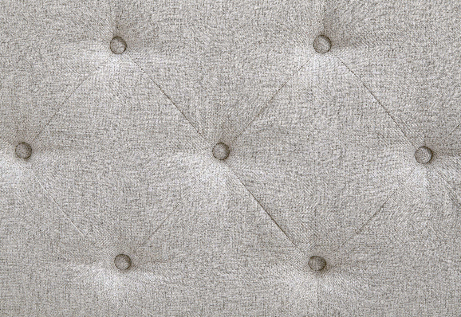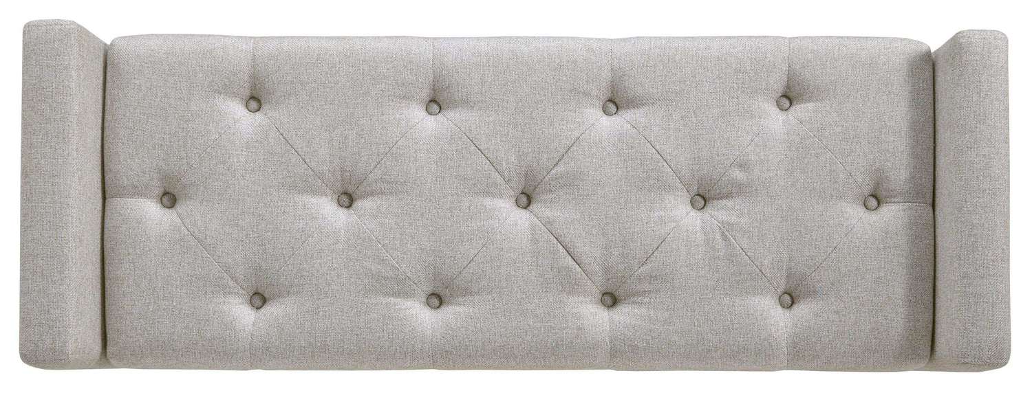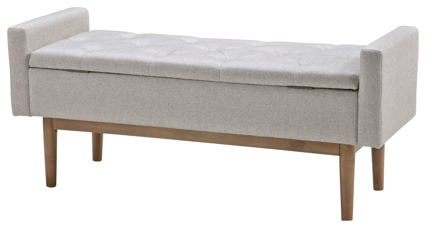 Contemporary style gets practical with this bench. The tufted beige seat cushion is hinged to allow easy access to whatever you need to hide in plain sight. The raised edges give the impression of arms on this cushioned seat while the light brown finished wood legs help it blend with many different modern styles.