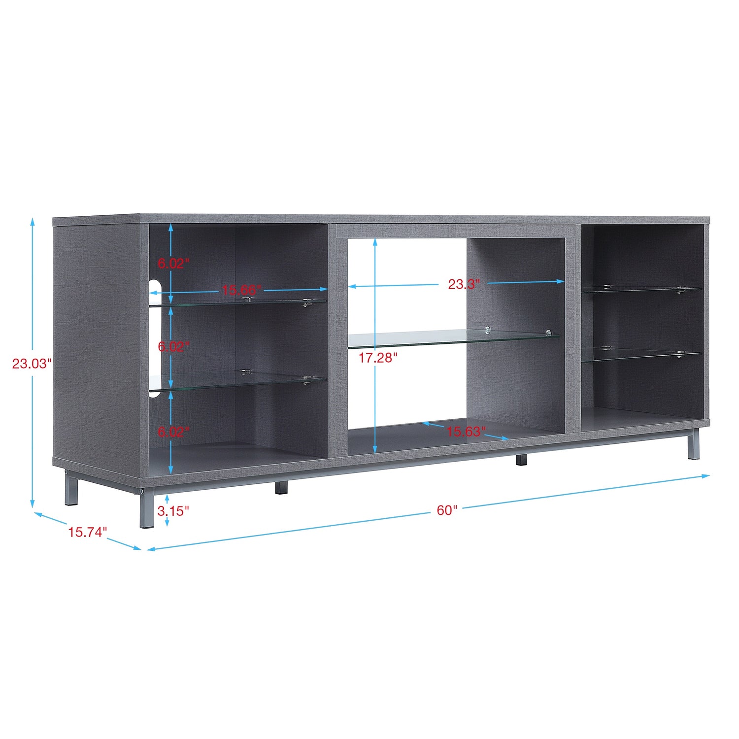 - Upon assembly, TV Stand Dimensions Measure: 60 in. Length, 24 in. Height, 16 in. Depth.