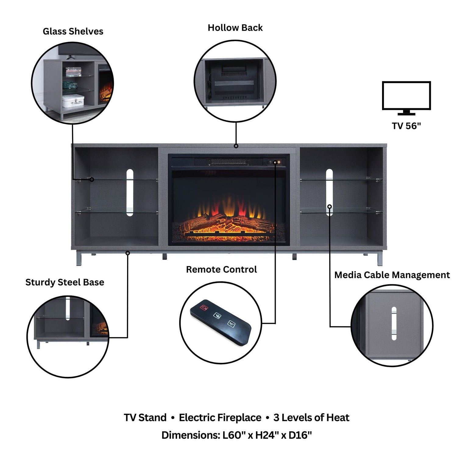 - Upon assembly, Electric Fireplace Dimensions Measure: 23 in. Length, 17.1 in. Height, 5 in. Depth. TV Stand Dimensions Measure: 60 in. Length, 24 in. Height, 16 in. Depth.