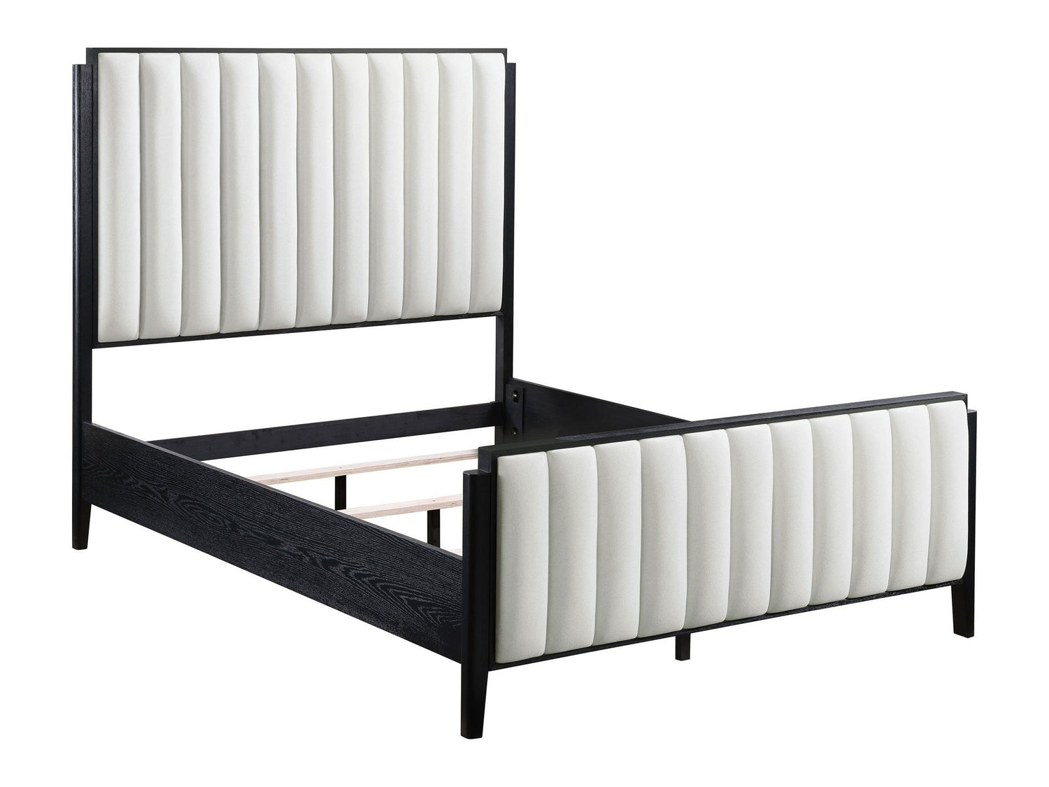 - Ivory upholstery and a crisp black wood grain finish create depth and contrast in your bedroom