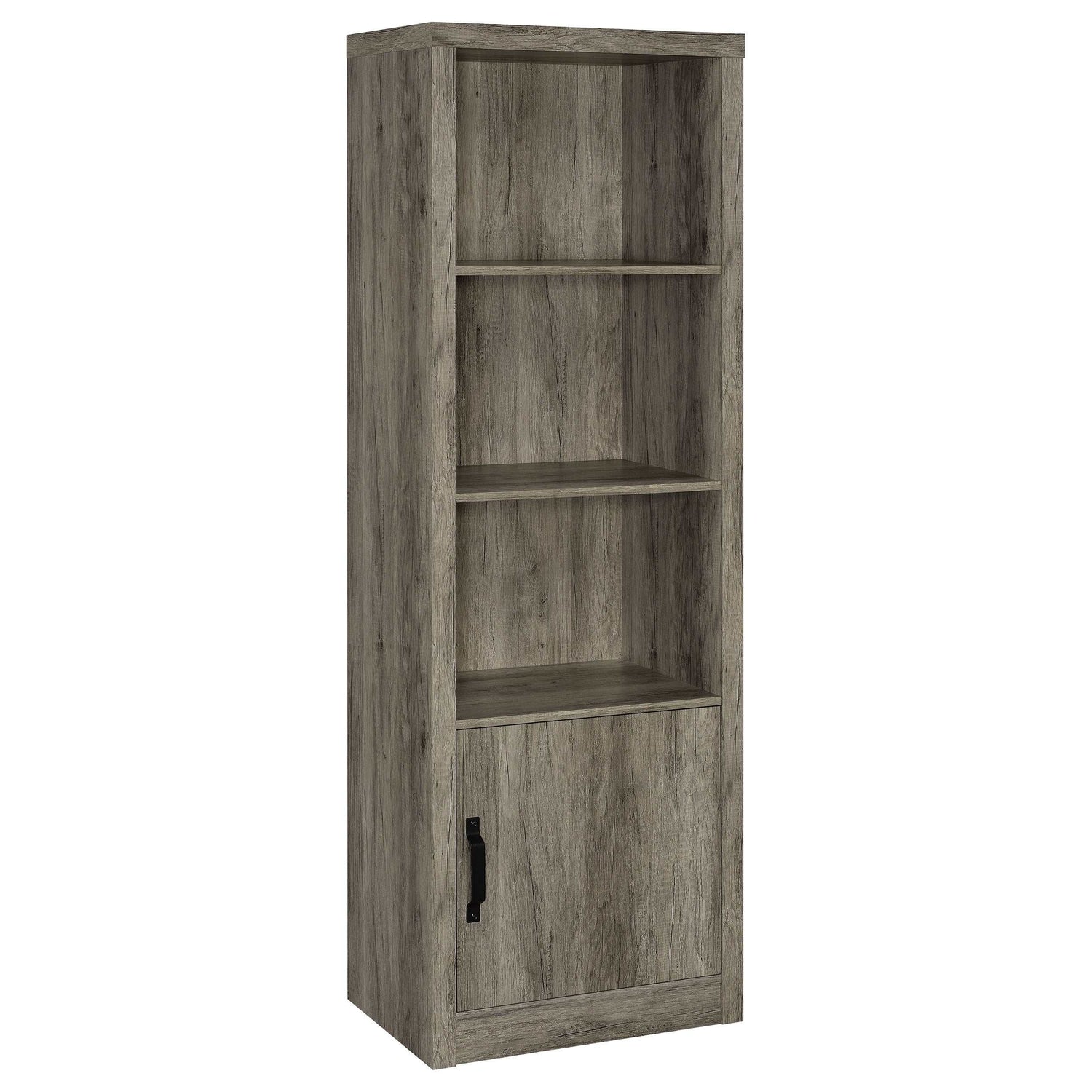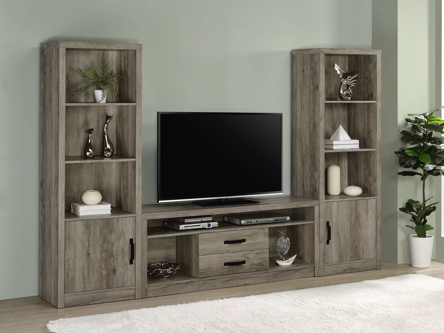 Create an entertainment mecca with this three-piece media center featuring a central TV stand and two media towers with gray driftwood finish laminate surfaces for durability and scratch/dent resistance
