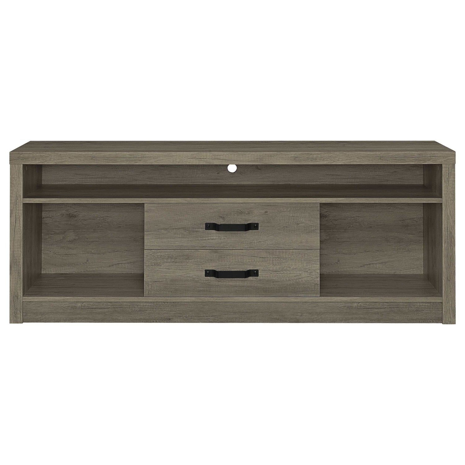 Design the entertainment mecca you've always imagined with this three-piece media center. Including a central TV stand and two media towers, the set delivers simplicity of silhouette with plenty of storage options to accommodate your needs. Gray driftwood finish laminate surfaces are durable and resistant to scratches and denting, offering impressive durability. The TV stand offers two open shelves and two drawers, each with contrasting hardware that adds a pop of dimension. The media tower each add three upper shelves and a lower cabinet, creating the perfect blend of storage and display spaces to bring personality to your welcoming living room.