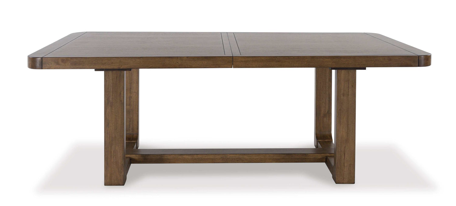This dining package sits comfortably at the intersection of modern lodge and farmhouse aesthetics. Your warm and welcoming disposition is reflected in the charming architectural elements and light brown glazed finish. Even with its poise, the set remains practical, defining your dining room with reliable function and style.