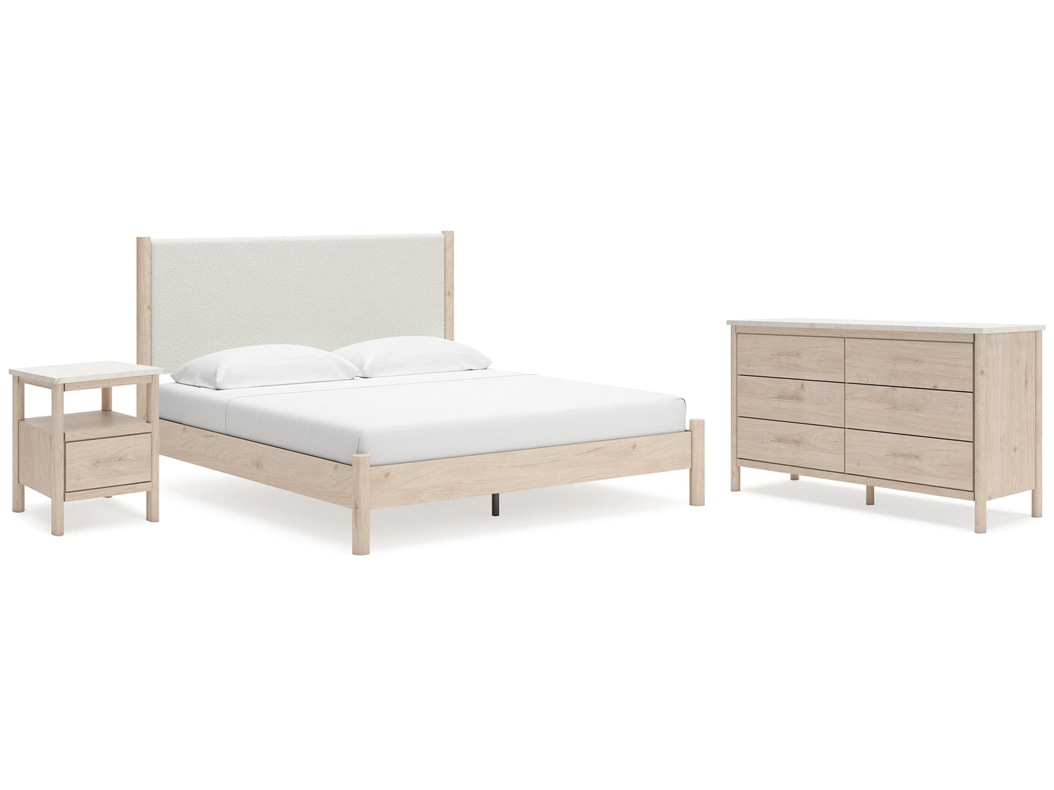 Cadmori Two-tone King Upholstered Panel Bed & Dresser & Nightstand