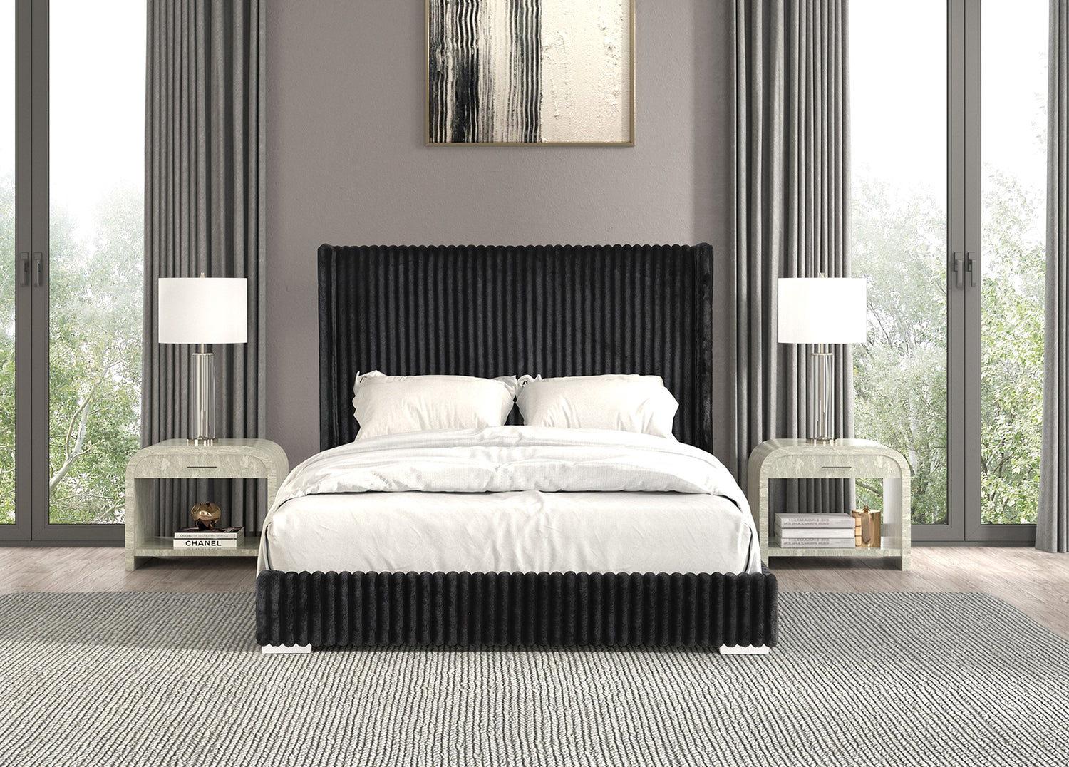 Introducing the Cadwell Black Bed, a contemporary piece made of luxurious fur chenille fabric. Experience a new level of comfort and style with its sleek design and soft texture. Elevate your bedroom with this high-quality bed that will bring both elegance and coziness to your space.