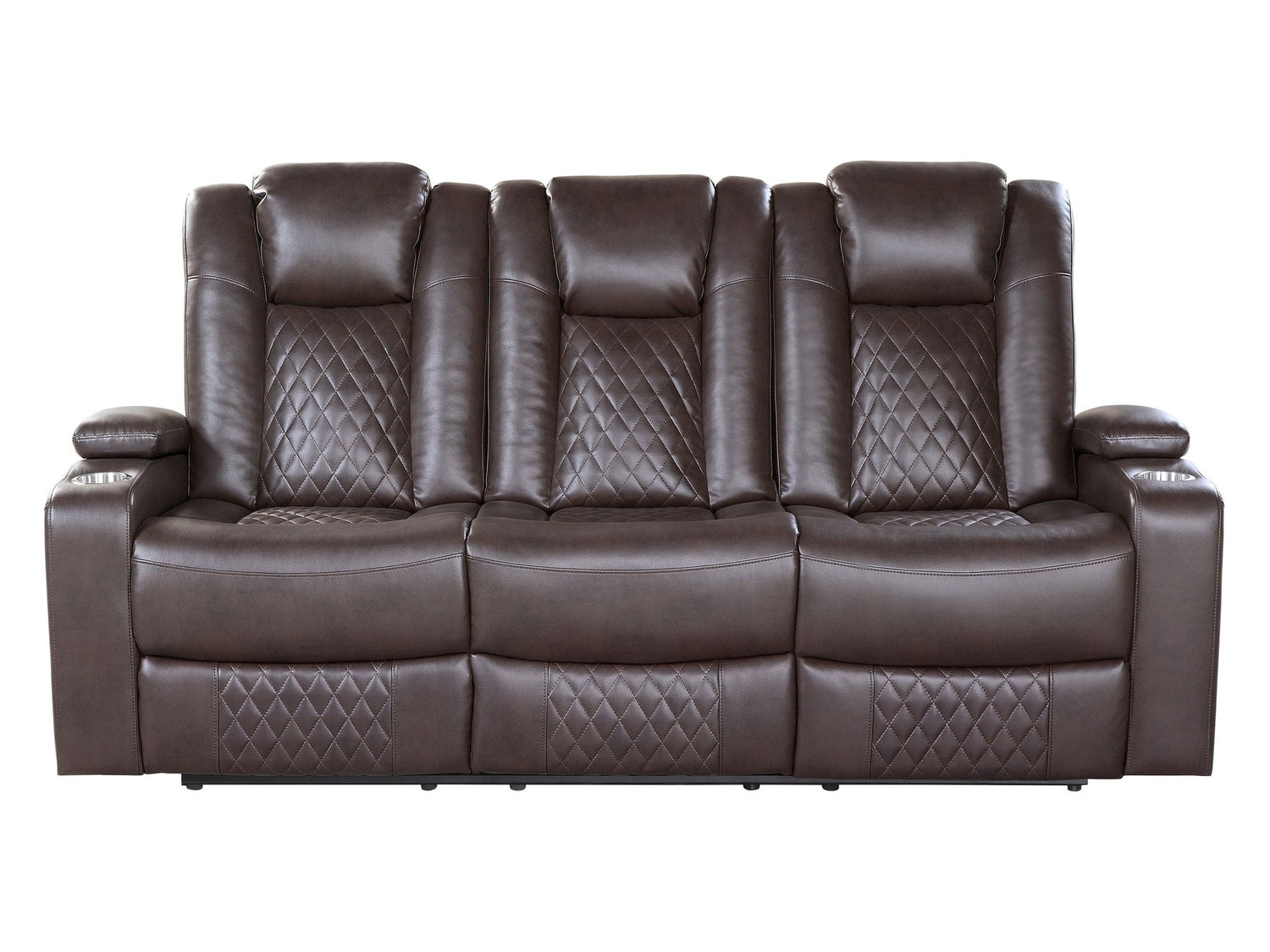 The well-appointed Caelan Collection pairs functional accessories with plush seating, allowing for your maximum efficiency while relaxing. The power motion sofa features dual reclining ends with power headrests, storage arm, drop down seatback that has cupholders, tabletop, receptacles, and USB ports. The collection is covered in dark brown premium faux leather upholstery and has diamond pattern stitching on the seatbacks that provide decorative accent to the group.