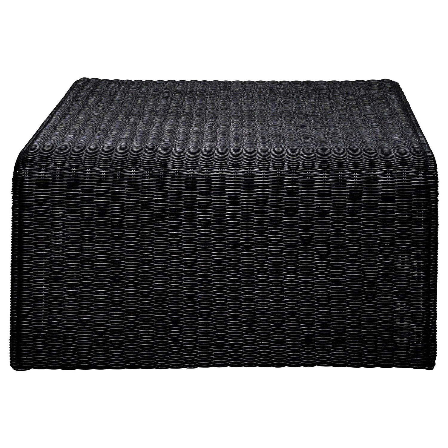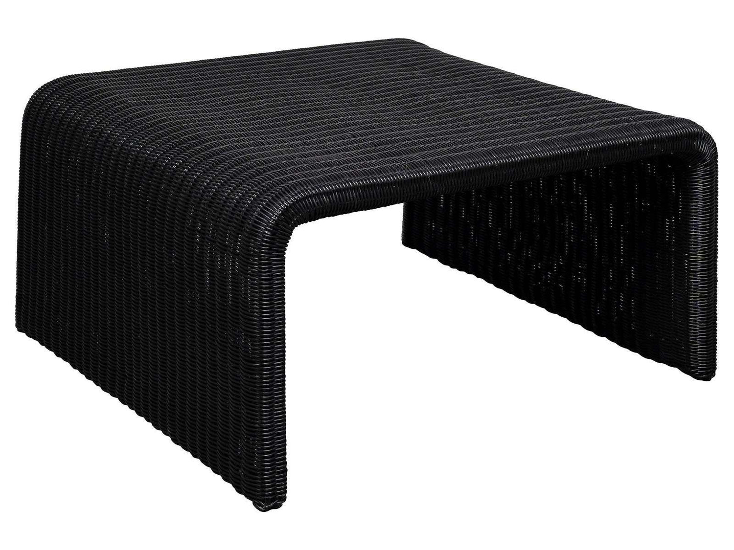 Revive the 70s with a minimalist inverted U-shape coffee table made of black metal and a woven surface for a touch of glam