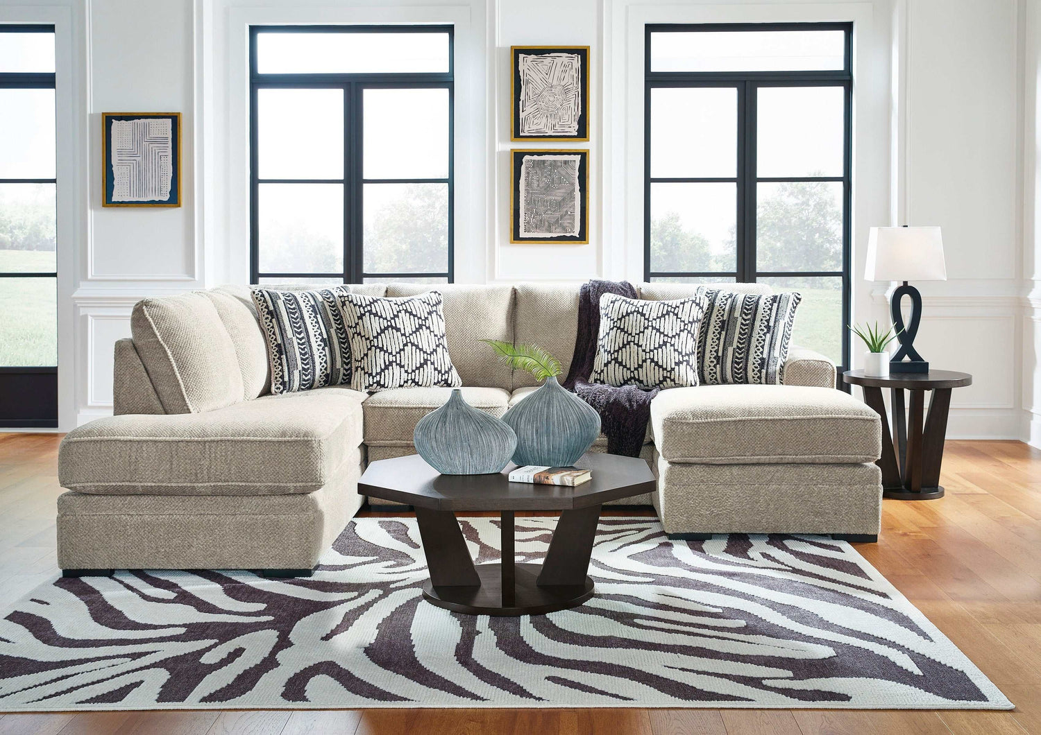 This sectional caters to your need for contemporary comfort. It’s decked out in feel-good fabric in a versatile hue. Family-friendly and ideal for hosts with the most, two chaises give more people the space the sprawl out. Quality time has never been so cozy.