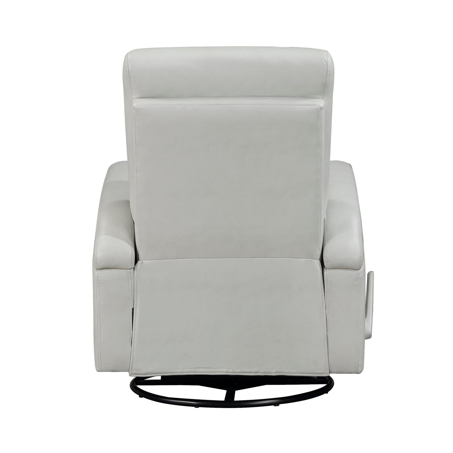 Modern lines and plush comfort combine to create the Camden Collection. Breathable faux leather covers the swivel glider recliner and is offered in Smoke for a perfect complement to your home’s décor. The open arm design lends to the modern profile while side mounted pull handle engages the manual reclining mechanism.