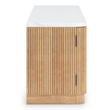 Elegance meets earthy charm in this TV stand. Crafting a contemporary living room? The faux marble top expertly pairs with the reeded base for a trend-right take on day-to-day function. Open shelving and subtly integrated storage cabinets make it easy to store and display media accessories in style.