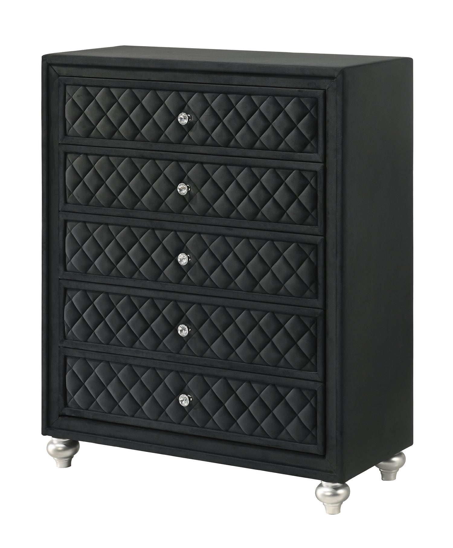 Indulge in timeless elegance and dramatic sophistication with this stunning bedroom collection, designed to make a bold statement. The centerpiece features an exquisitely tufted headboard with luxurious upholstery and intricate nailhead trim, exuding opulence and grandeur. Coordinating pieces showcase diamond-patterned tufted accents, mirrored details, and polished hardware, blending classic design with modern glamour. With ample storage and impeccable craftsmanship, this ensemble offers both style and practicality, creating a lavish retreat that embodies refined comfort and striking aesthetics. Perfect for those seeking a bedroom that radiates luxury and charm.