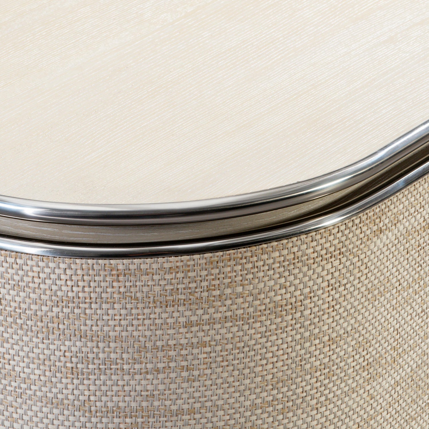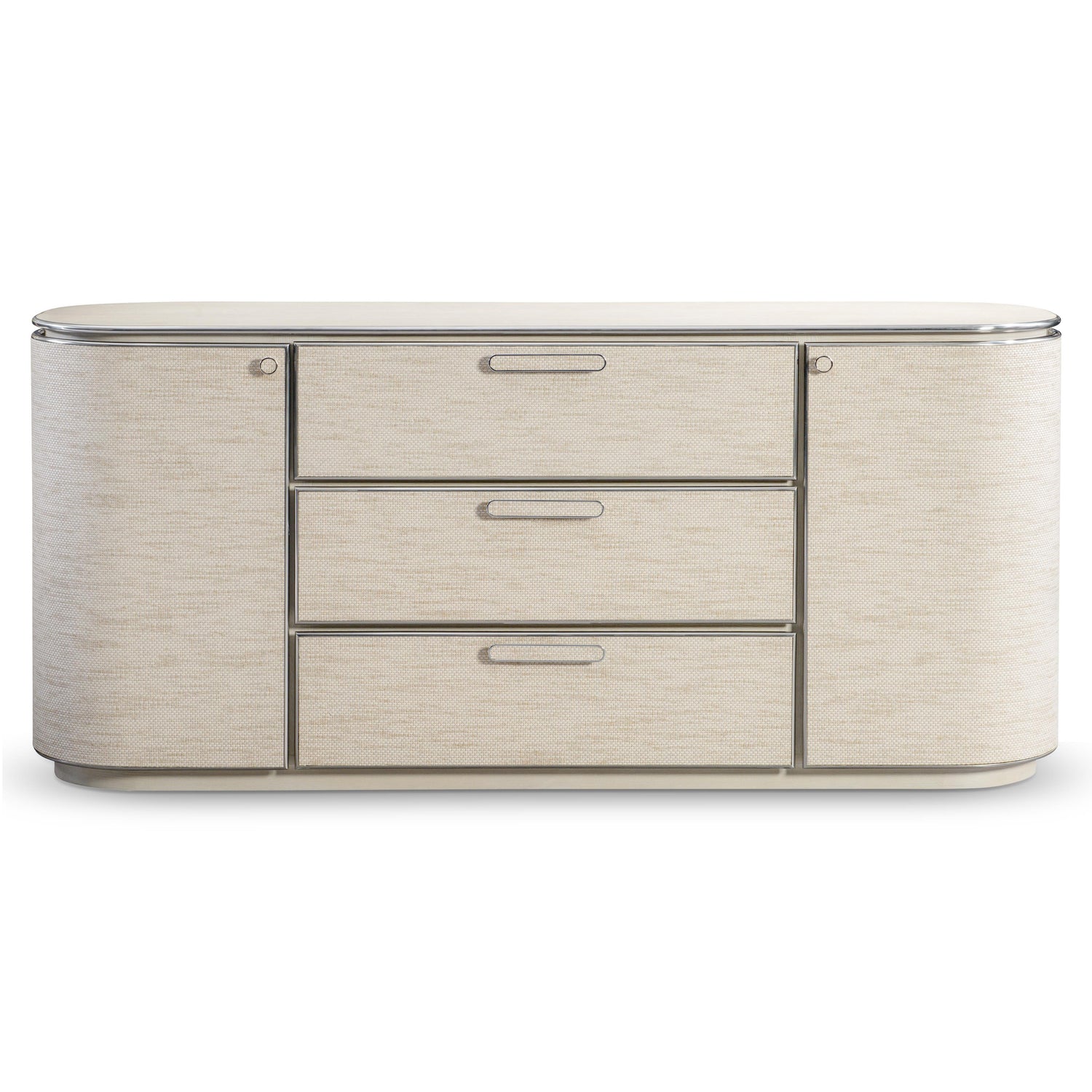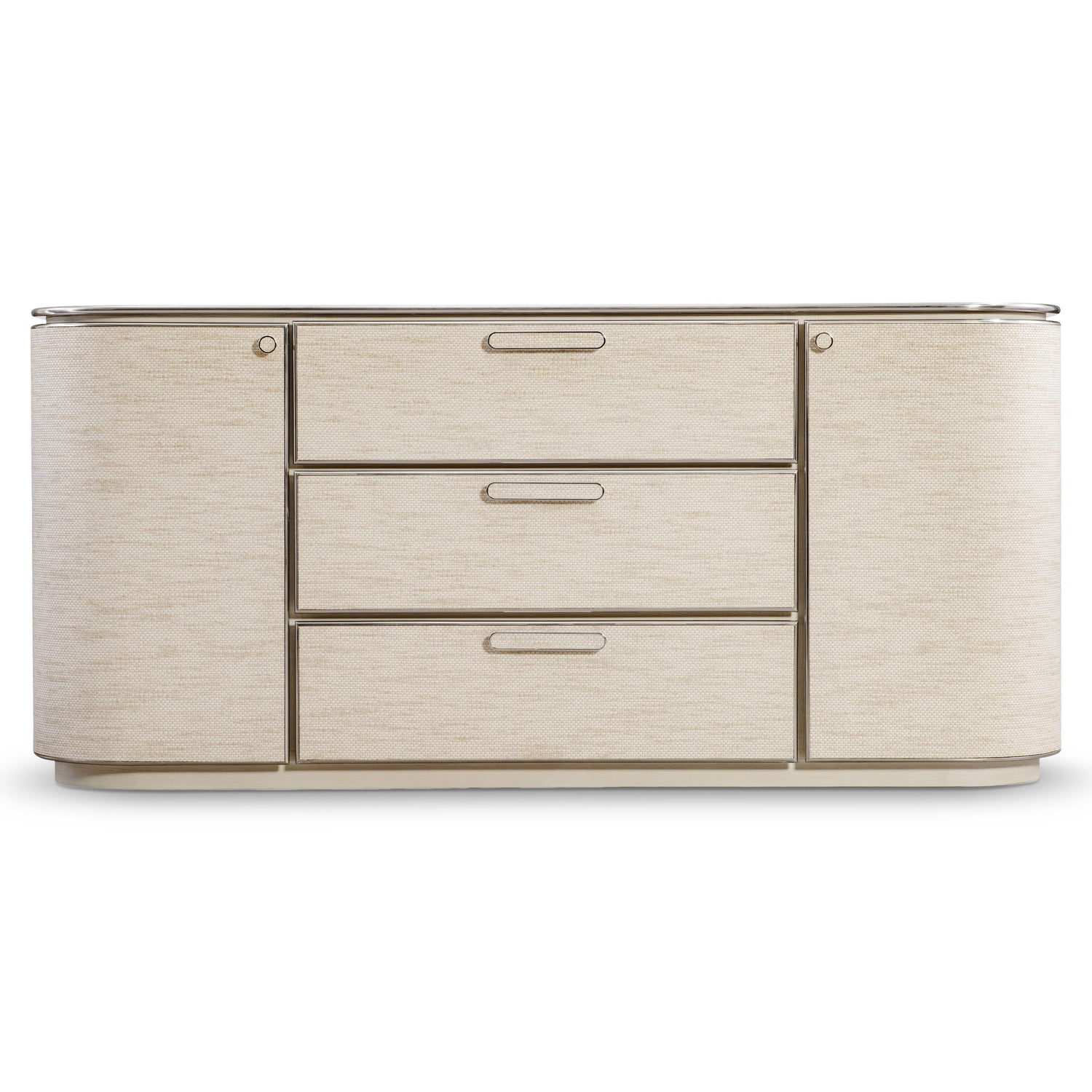 - Three woven-wrapped, pull-to-open, soft-close drawers with woven-wrapped knob pulls in Farine finish