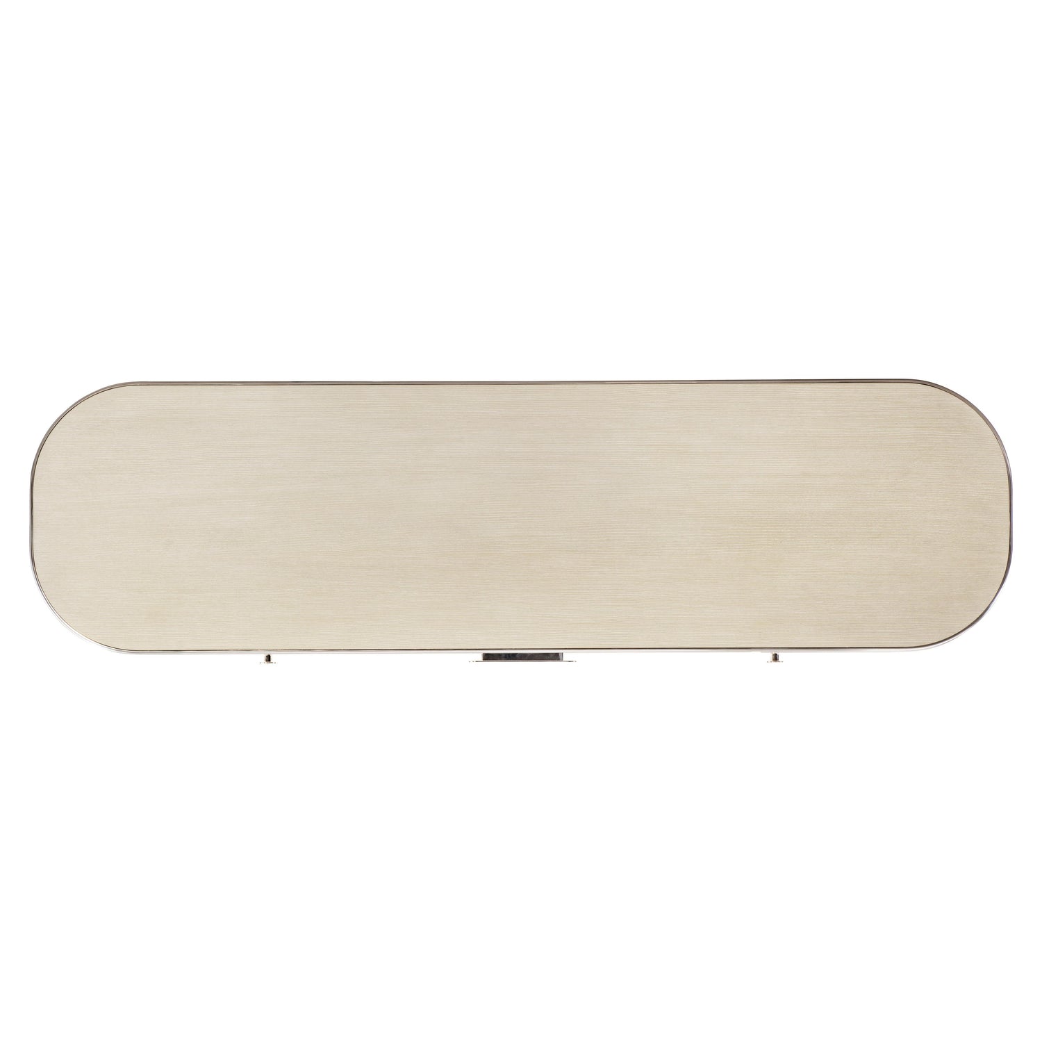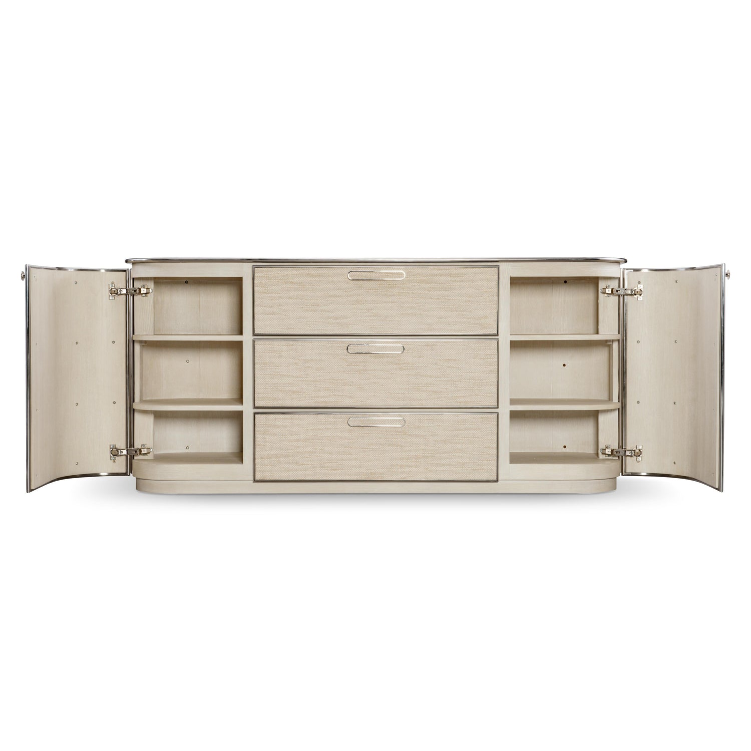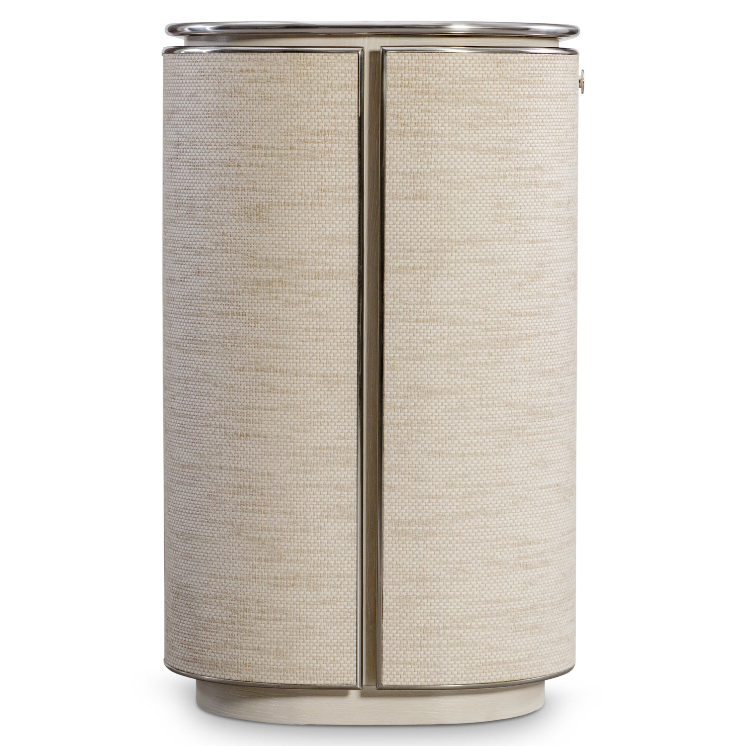- Two woven-wrapped, pull-to-open doors with woven-wrapped bar pulls in Farine finish