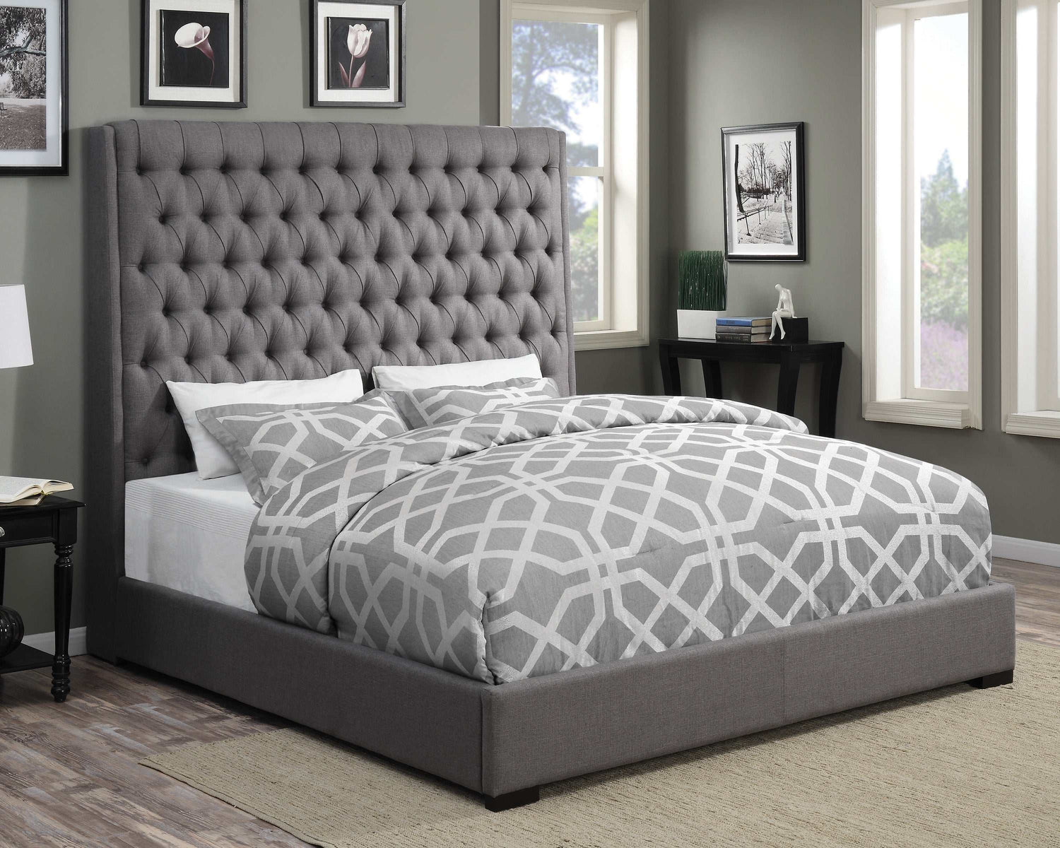 This impressively-styled bed makes a bold yet fashionable statement. It features an imposing, 72" high headboard that's bold. Yet, the headboard comes with button tufted fabric that's stylish and eye-catching. The bed sits on solid wood legs finished in lush cappuccino for a touch of charm. This bed is a graceful addition to the bedroom.