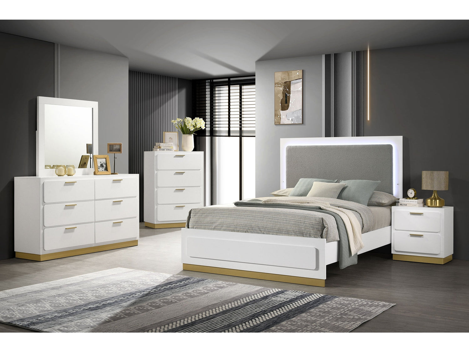 - Includes: One (1) queen bed, one (1) nightstand, one (1) dresser, one (1) dresser mirror, and one (1) chest- Upholstered headboard with touch LED lighting highlights a Five piece bedroom set