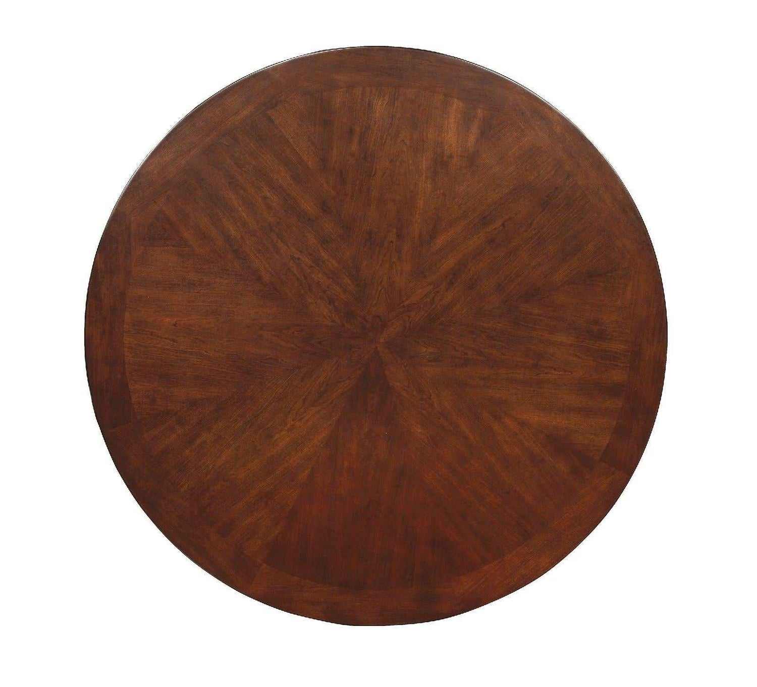 Add style to your small dining room with this round pedestal table. Both finished in brown cherry, the table and chairs complement each other well to produce a striking, transitional piece.