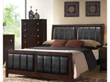 Get a taste of mid-century and retro personality. With a bold, exciting aesthetic, this bed offers a compelling focus in any room. Its divided headline features padded leatherette sections. A cappuccino finish creates a dynamic effect. Create an eye-catching ensemble with this bed at its center.