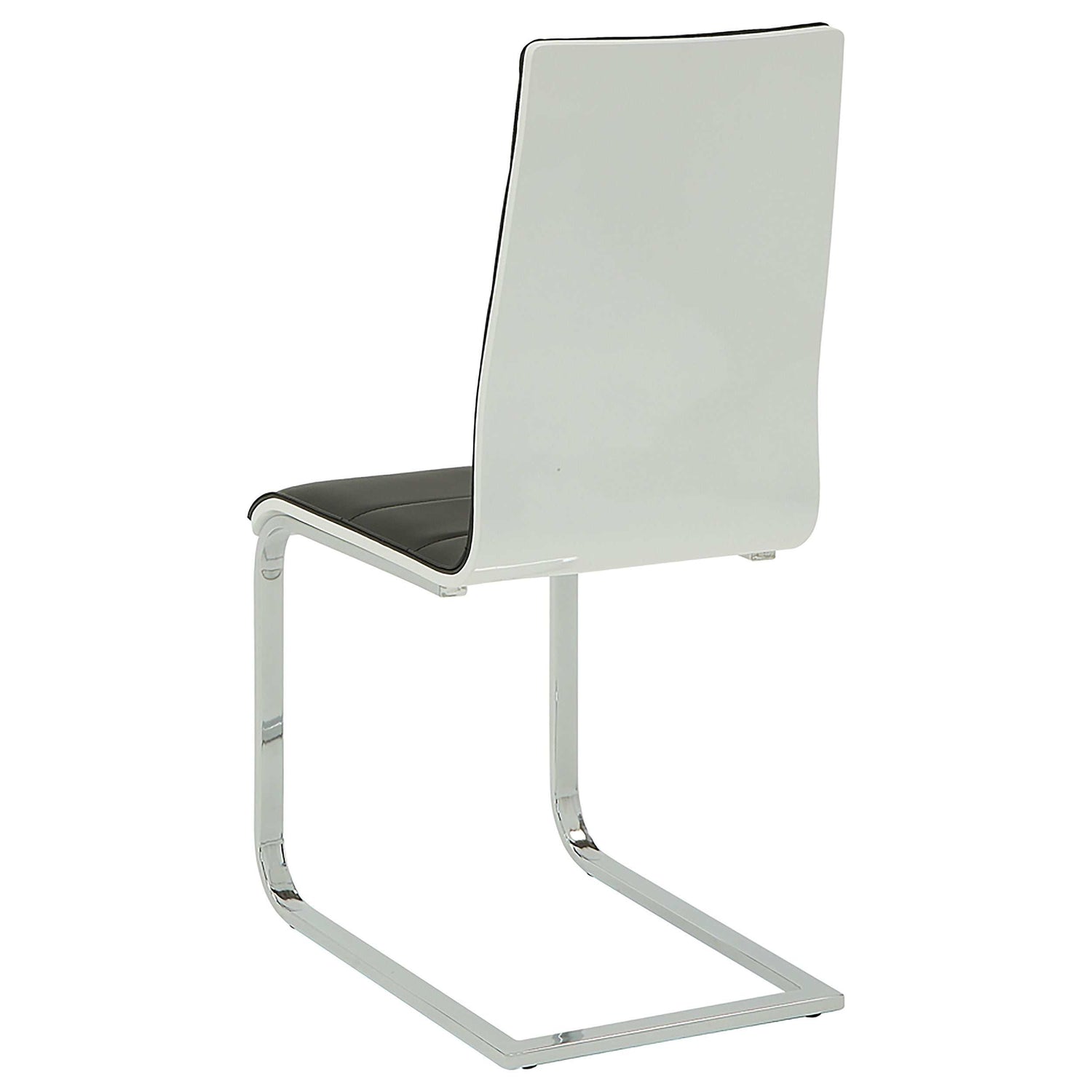 This contemporary five-piece dining set showcasing chrome and glass makes the perfect showpiece in a modern home. The set includes a rectangular glass table and four shapely chairs that are visually stunning. The rectangular extra thick tempered glass of the tabletop virtually “floats" on a chrome finish asterisk metal base that steals the show. The four chairs feature shapely lines and channel stitching in contrasting black and white leatherette for a stunning contrast. The base and legs are crafted with a lustrous chrome finish that imbues your dining space with glam and pizzazz.