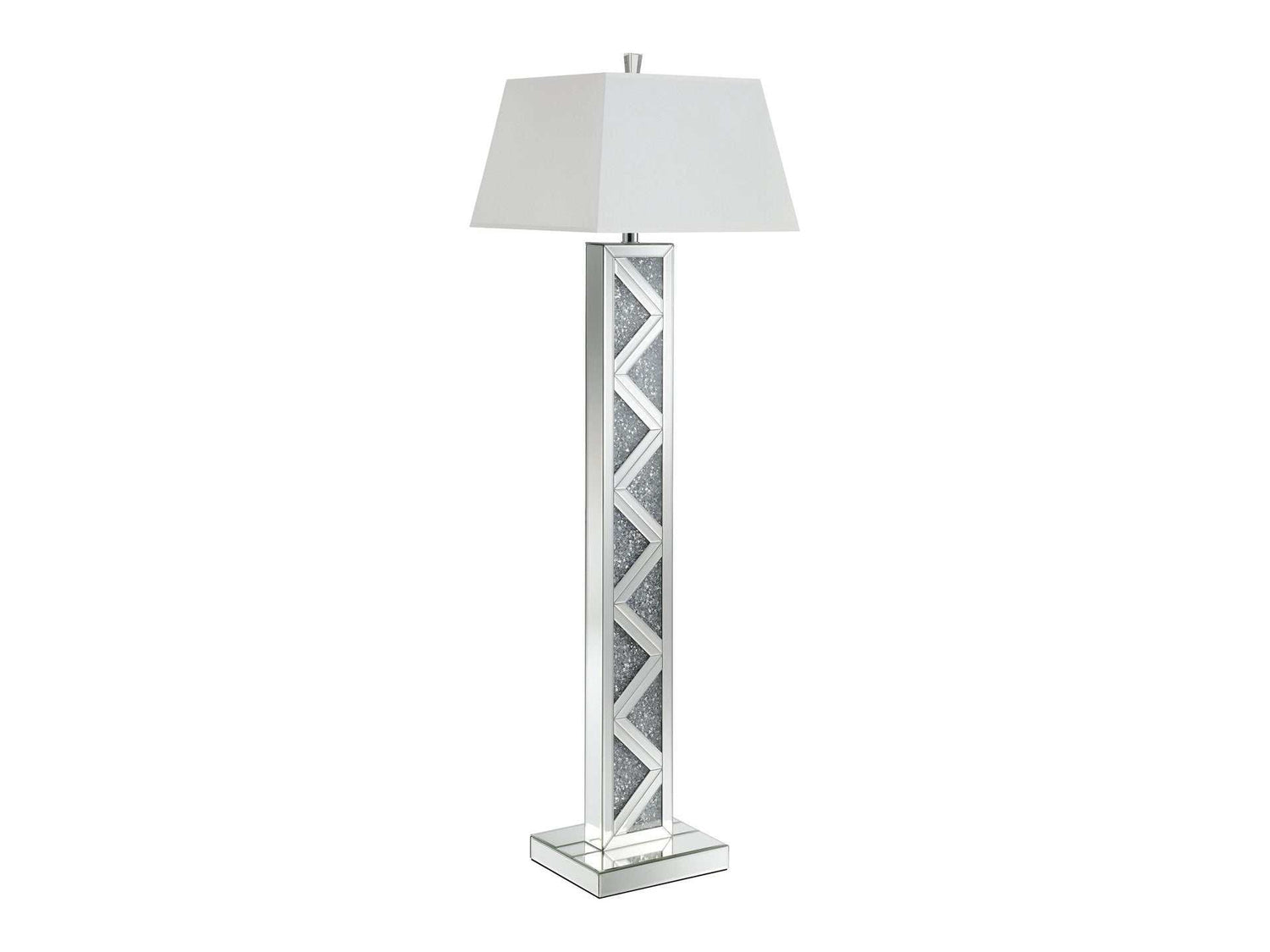 Open up your modern space with this floor lamp. Geometric design elements bring the contemporary nature of the piece to the forefront. Bright silver finish allows for easy matching with other pieces. Rectangular lampshade creates unique visual interest. Brightening up any contemporary or modern space is as easy as including this lamp.