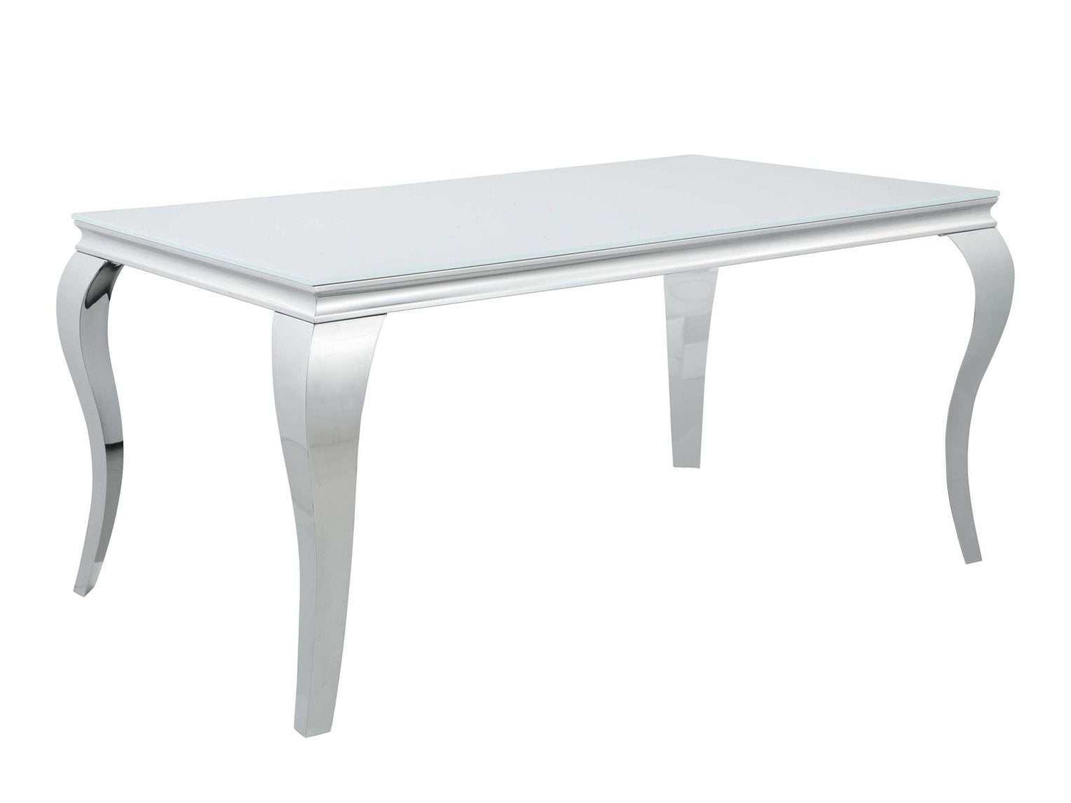 Glamorous with a luxurious touch, this elegant dining table makes the perfect addition to a formal dining space. With a mixed material design of durable stainless steel and glass, this dining table lends itself to several home decor styles. On each traditional Cabriole style leg is a gleaming chrome finish. Gather family and guests around the opaque tempered glass tabletop. In addition, this dining table seats six people comfortably.