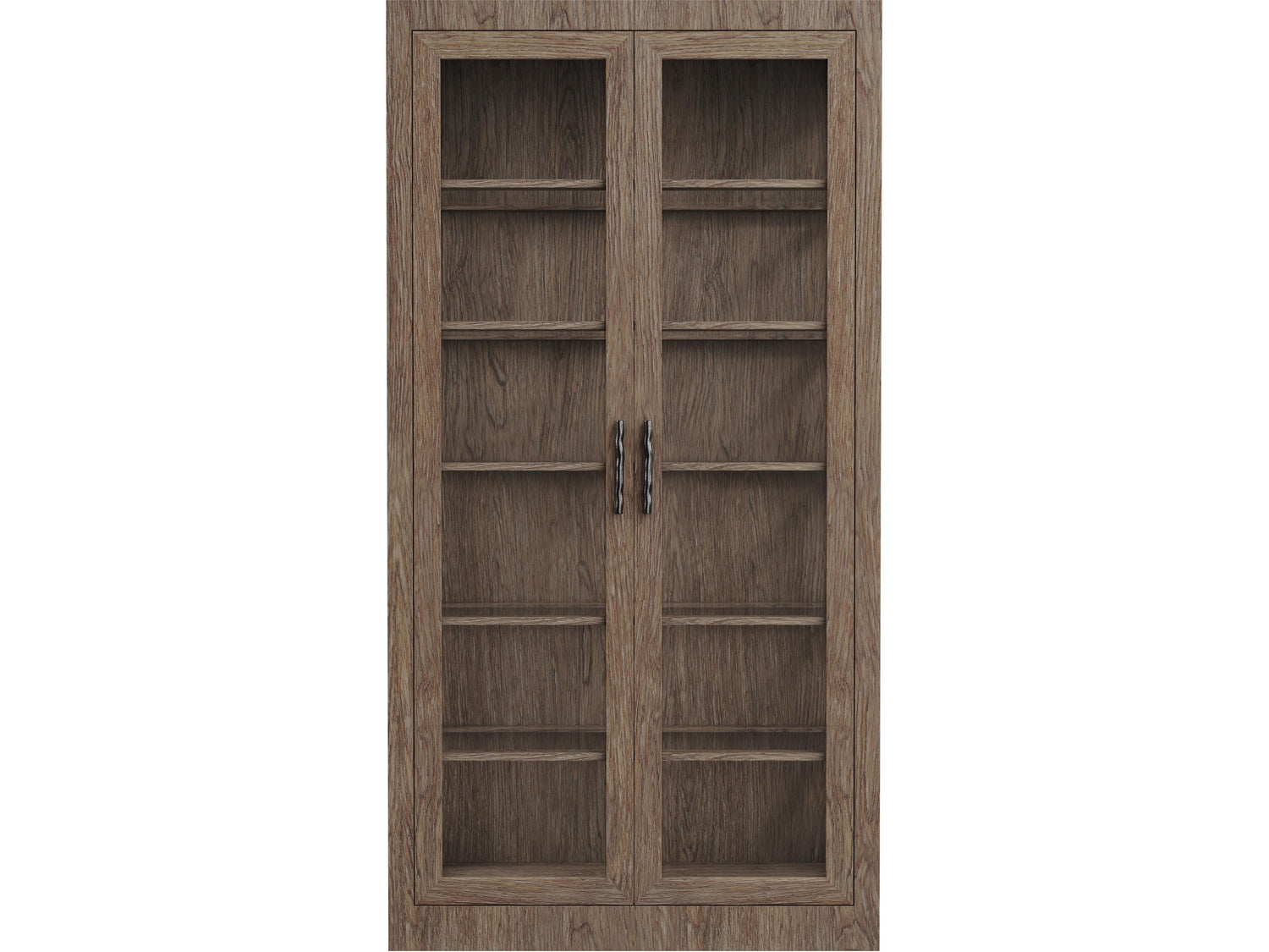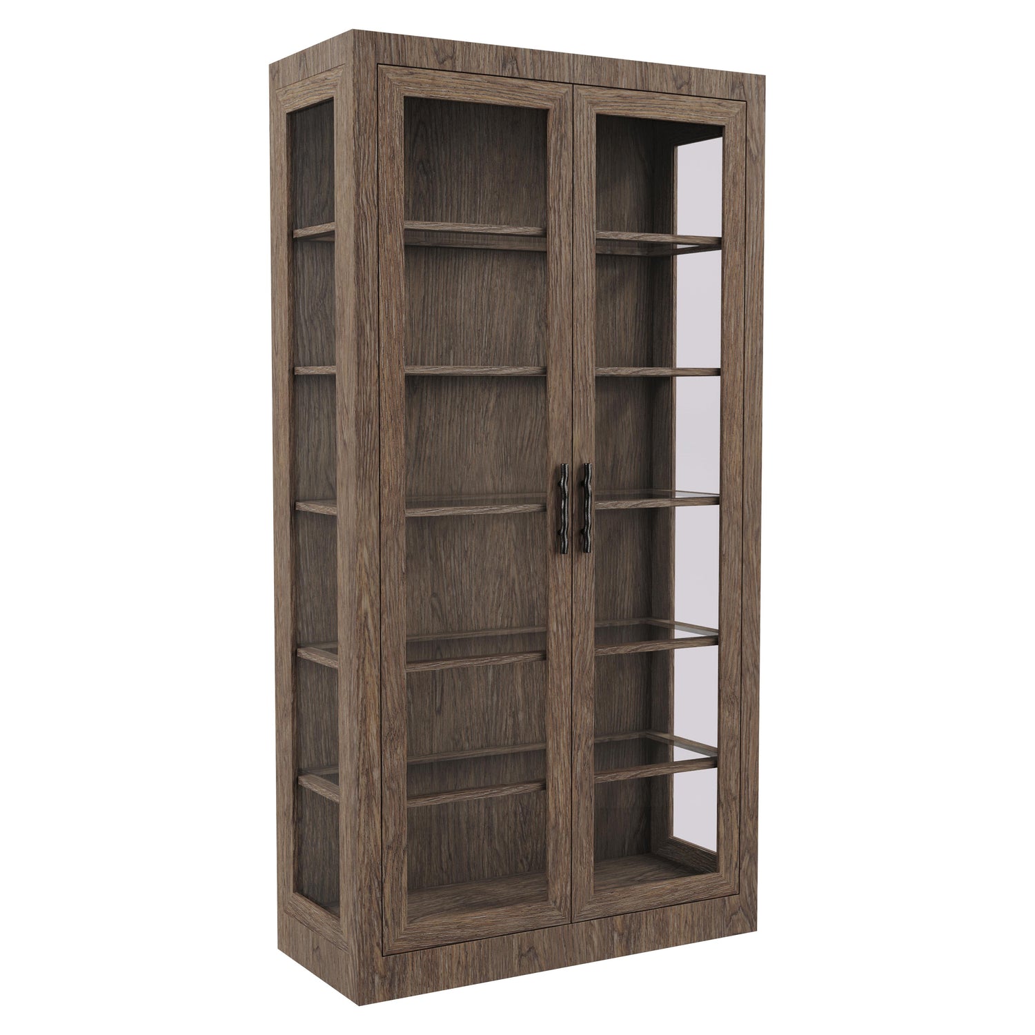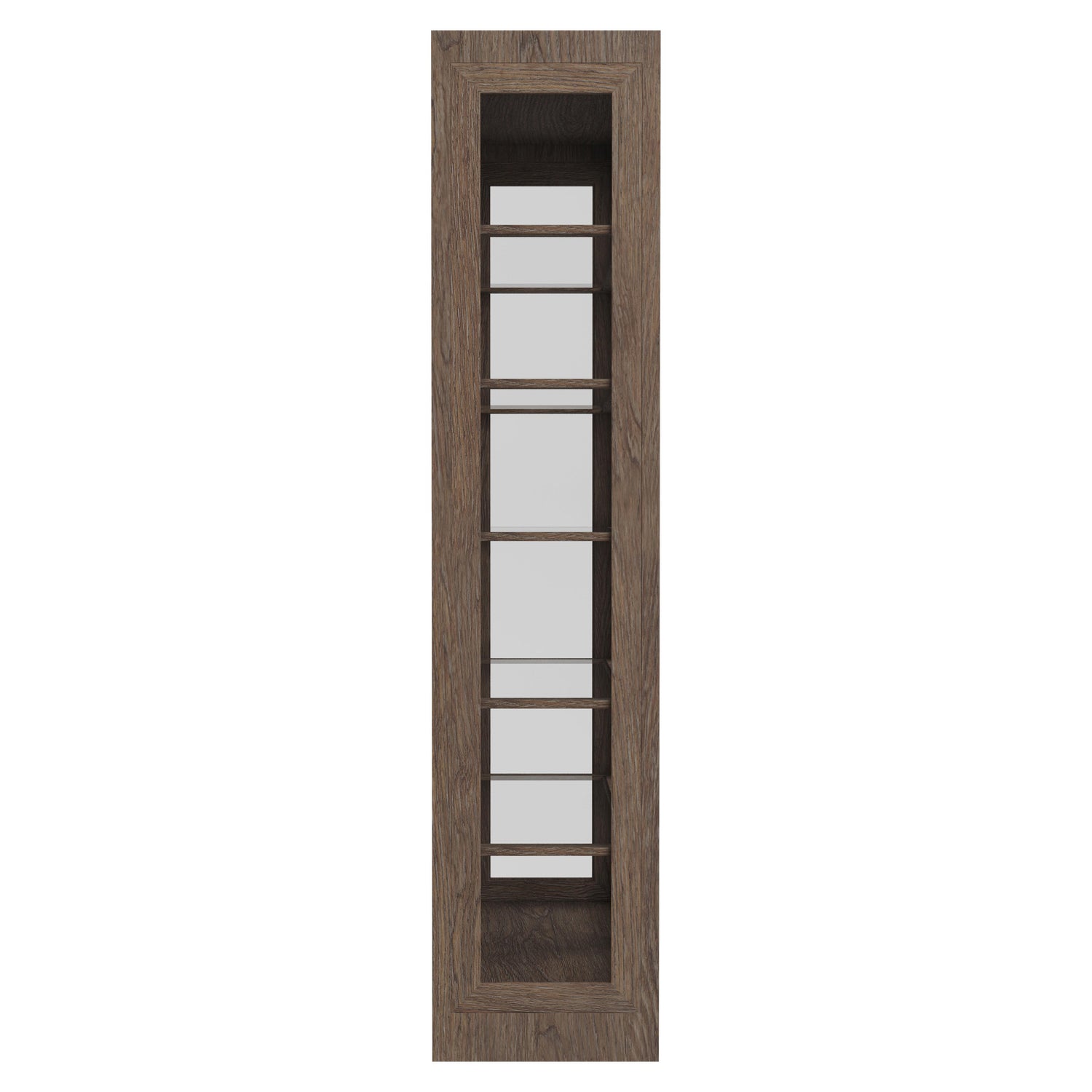 - Five wood-framed tempered glass shelves with polished edges and wood bottom surface