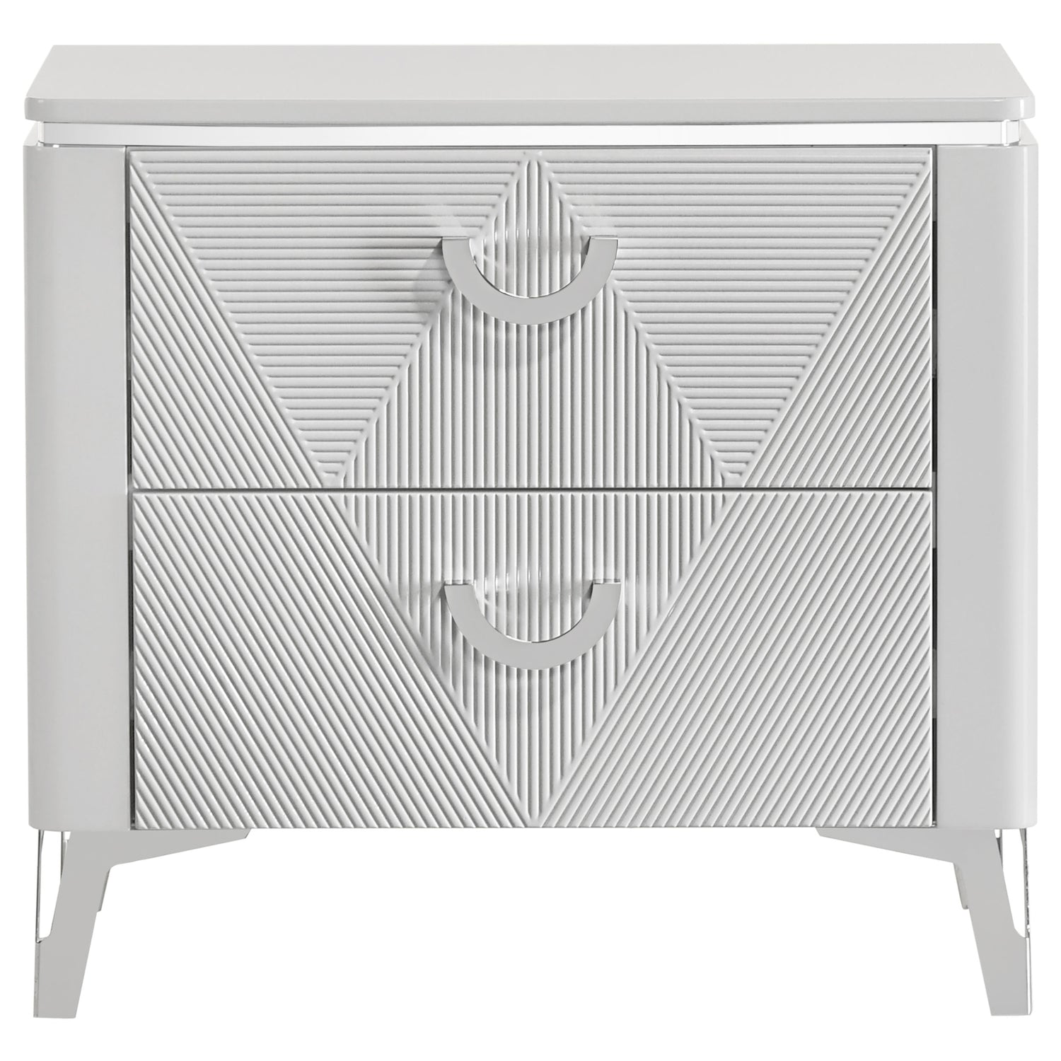 - Modern nightstand in white high gloss finish features sculptural geometric drawer fronts,