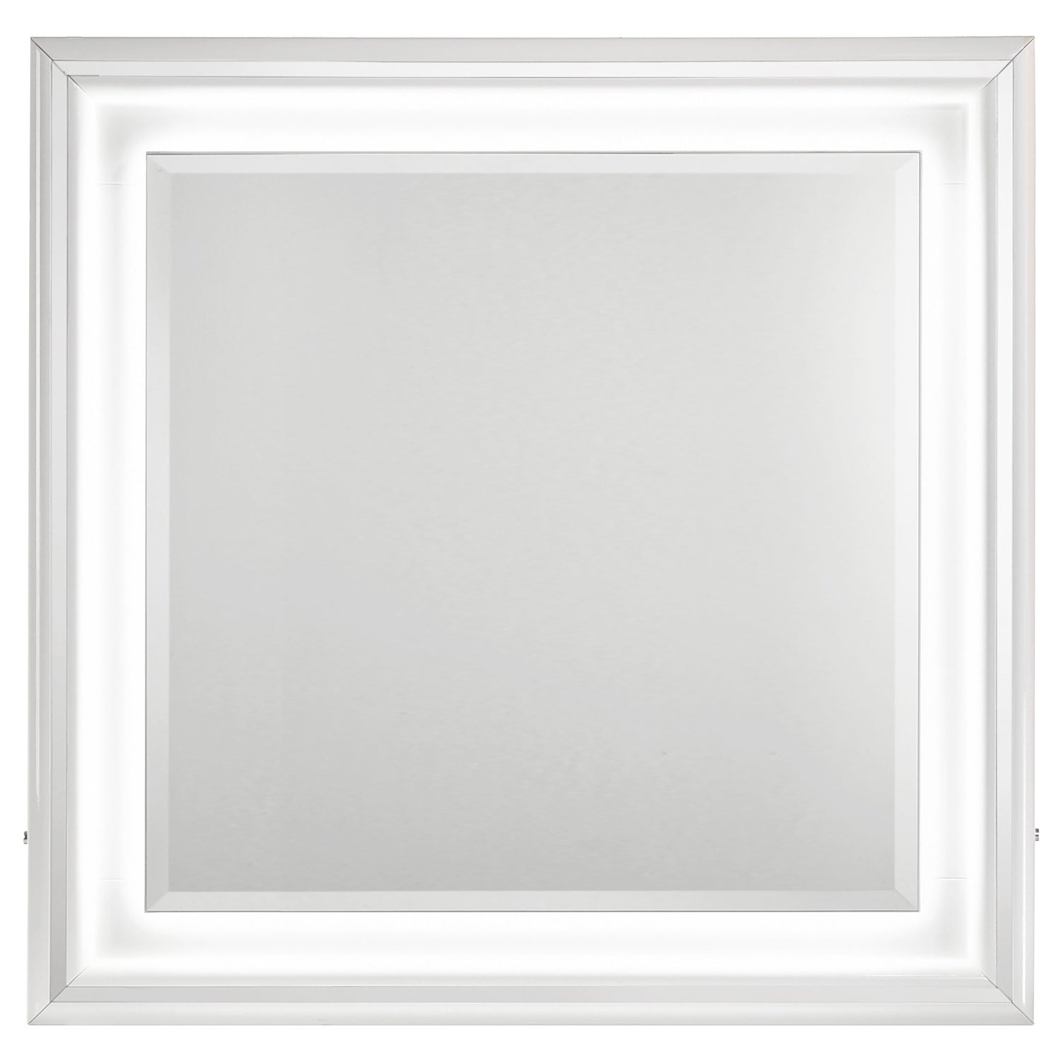 - LED dresser mirror adds ambient lighting and visual symmetry to the modern design,