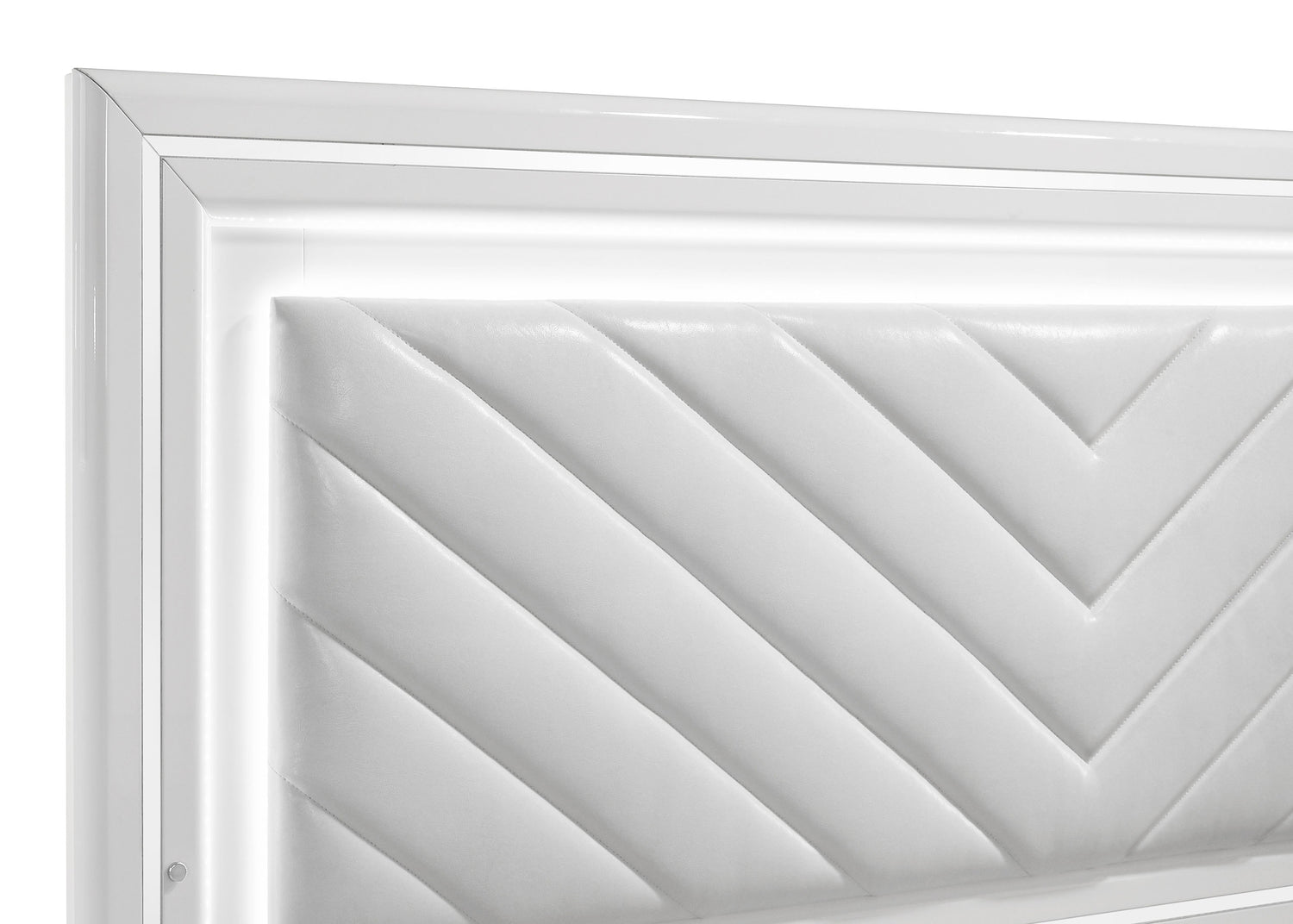 - White high gloss bedroom set with sculpted drawer fronts and chevron-tufted LED headboard,