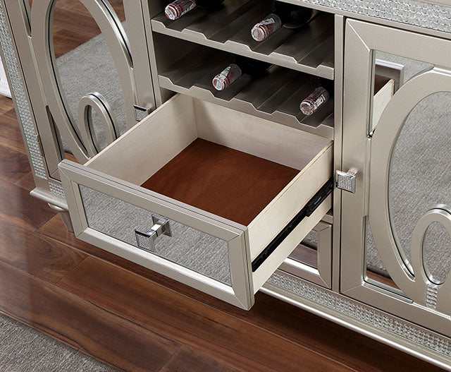 Differentiate your dining room with the beautiful mirror tile accents and brilliant tones of this transitional style server. It comes with plenty of storage for wine and dining utensils.