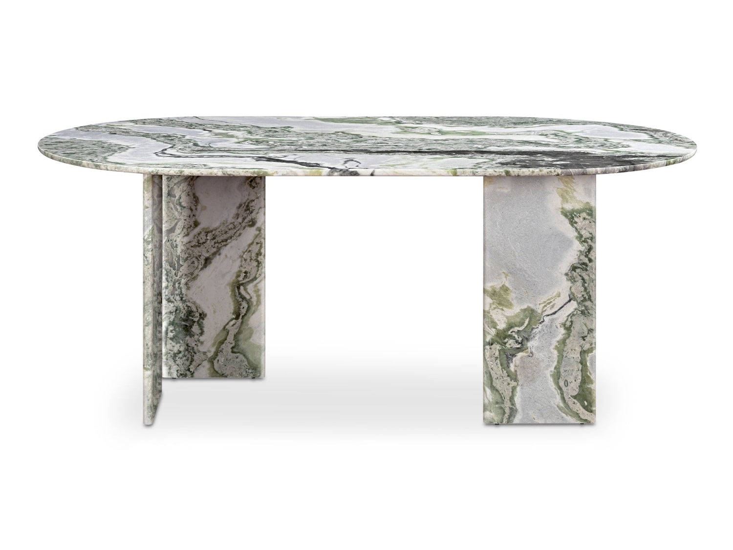 The Celia oval dining table effortlessly combines contemporary flair with a timeless silhouette. The table's allure is further enhanced by expressive green onyx marble, adding a touch of artistry and opulence. The smooth and organic textures on the marble beautifully contrast with the table's geometric base, creating an intriguing visual harmony and exuding an undeniable sense of elegance and versatility.