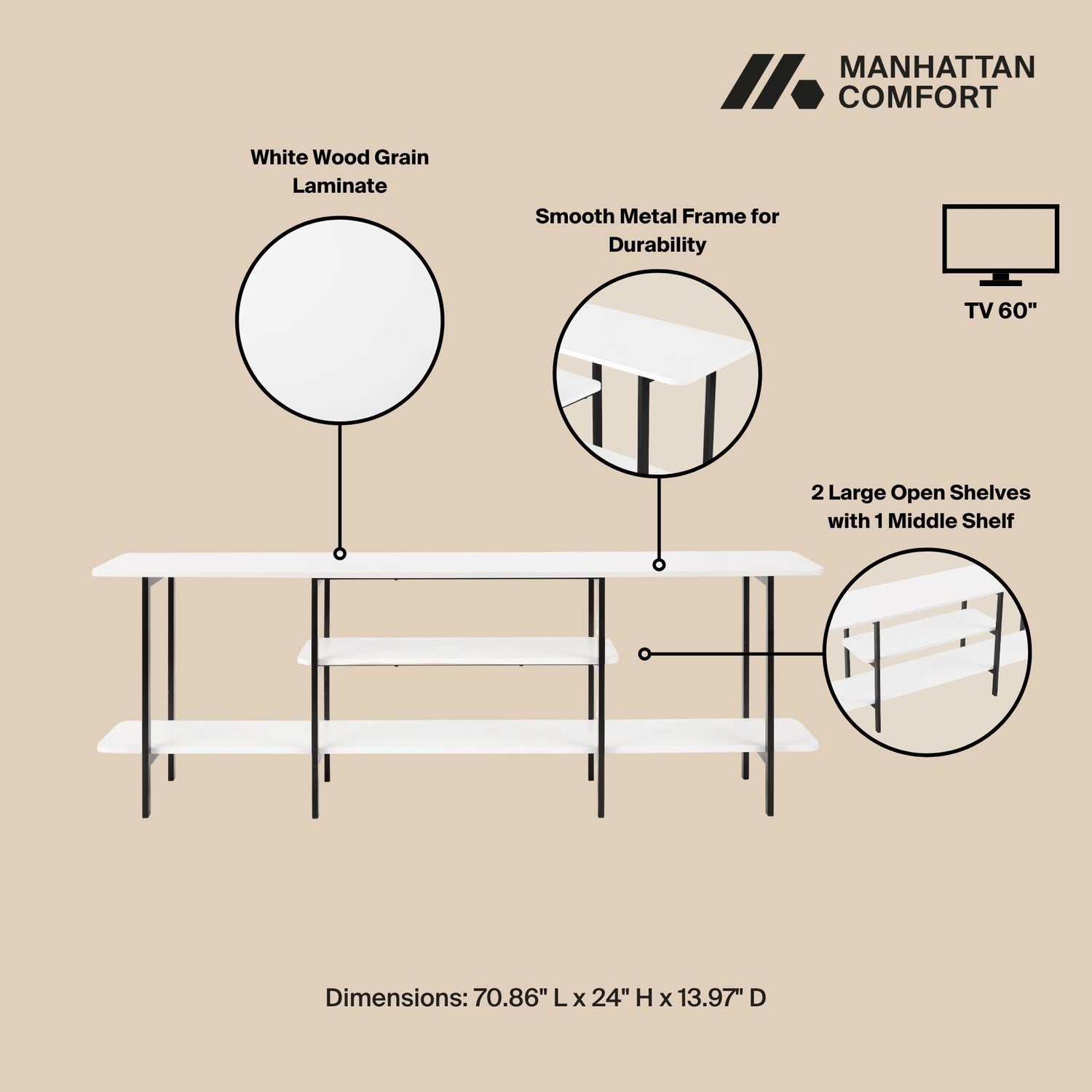 - Upon assembly, Side Table / Console Dimensions Measure: 70.86 in. Length, 24 in. Height, 13.97 in. Depth.